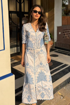 Palms-inspired honeycomb embroidered skirt with scallop lace trim paired with an embroidered blouse top.