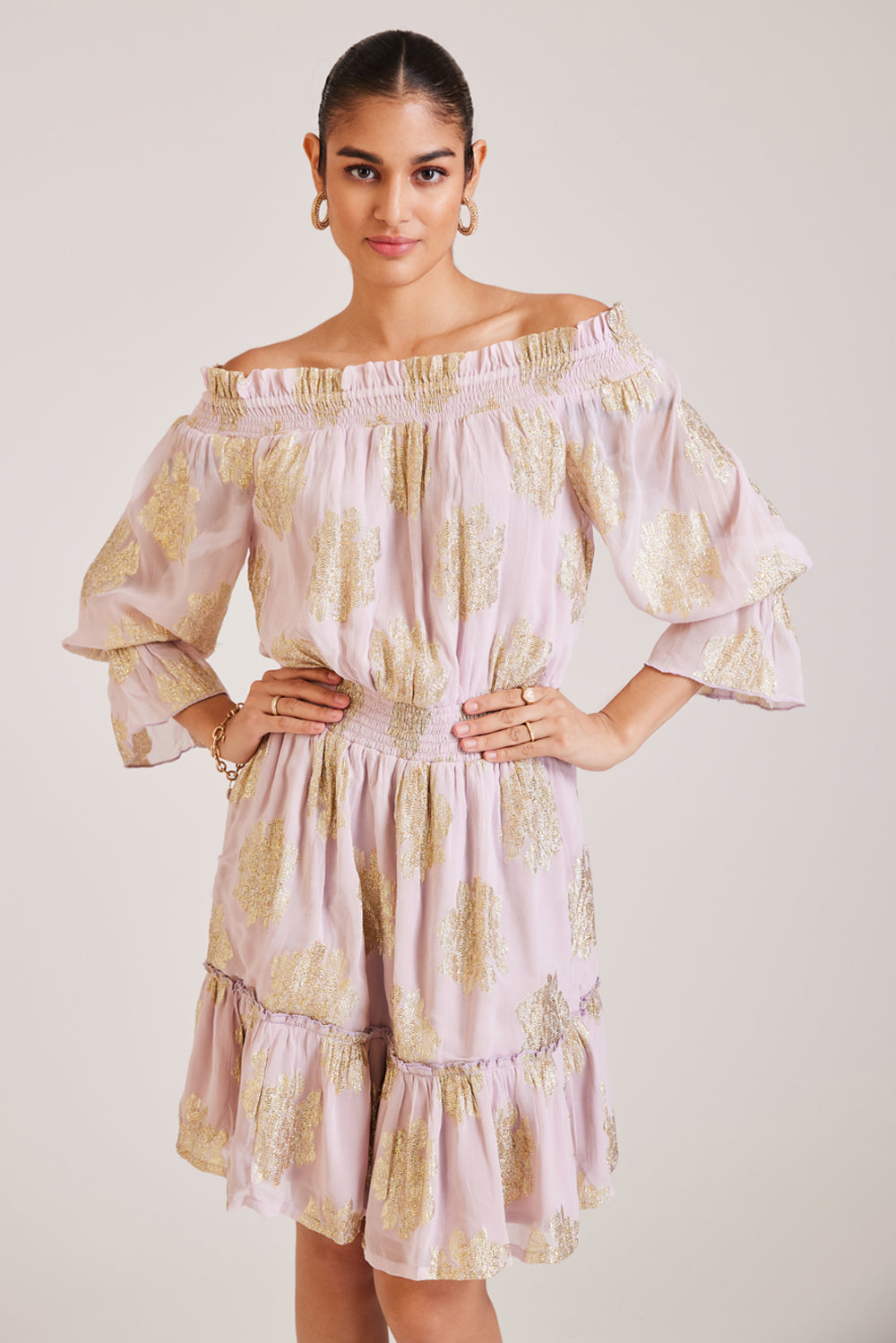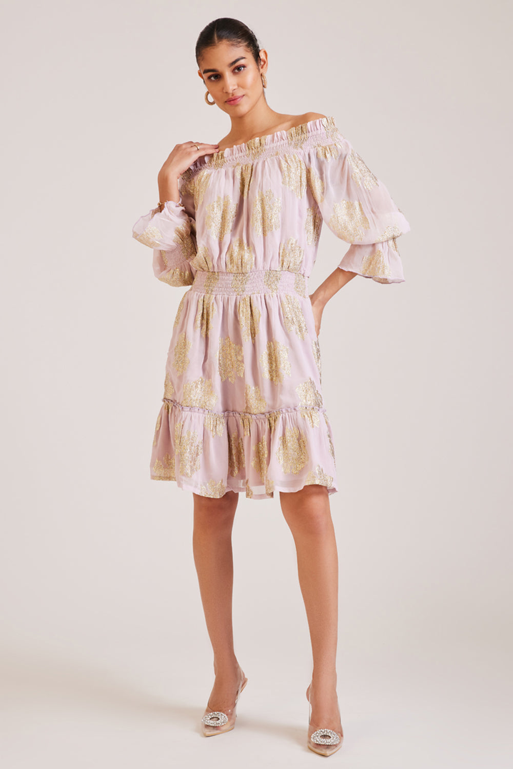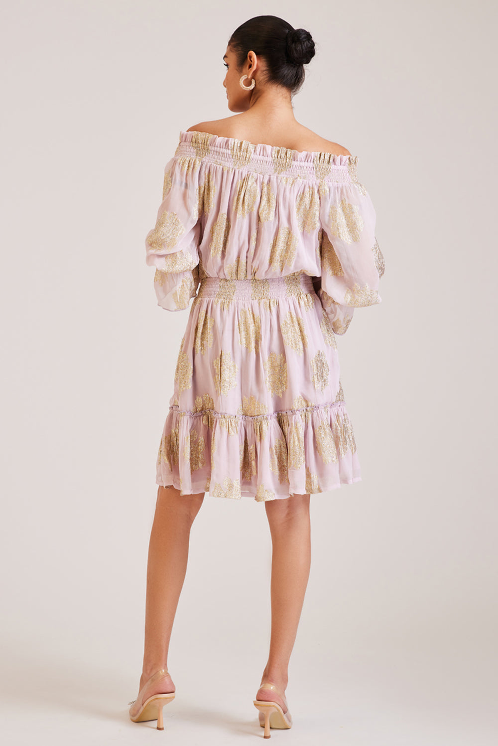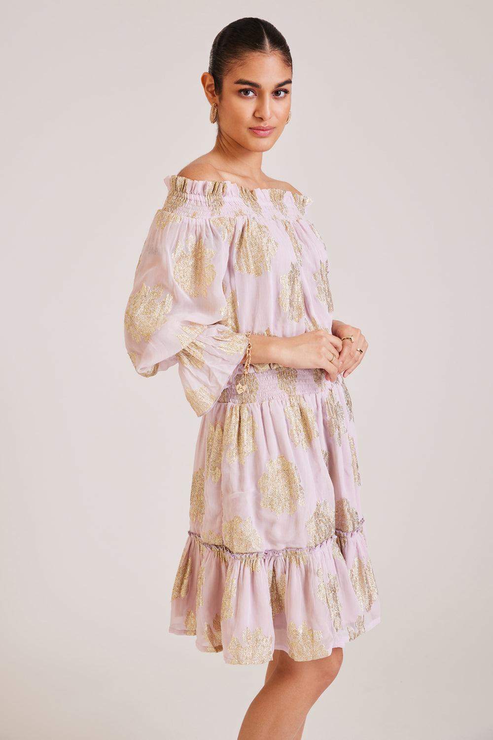 Off The Shoulder Metallic Ruffled Dress