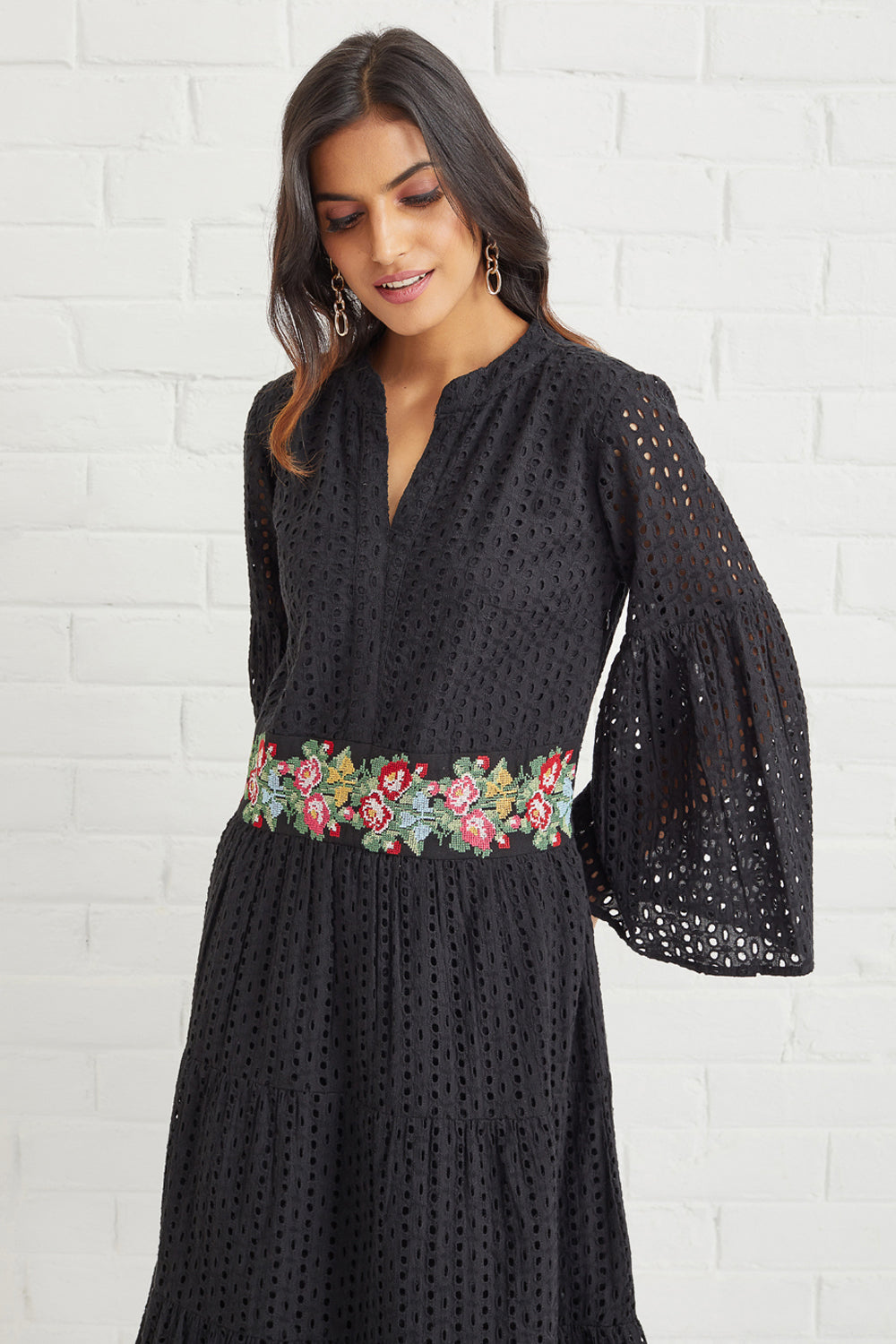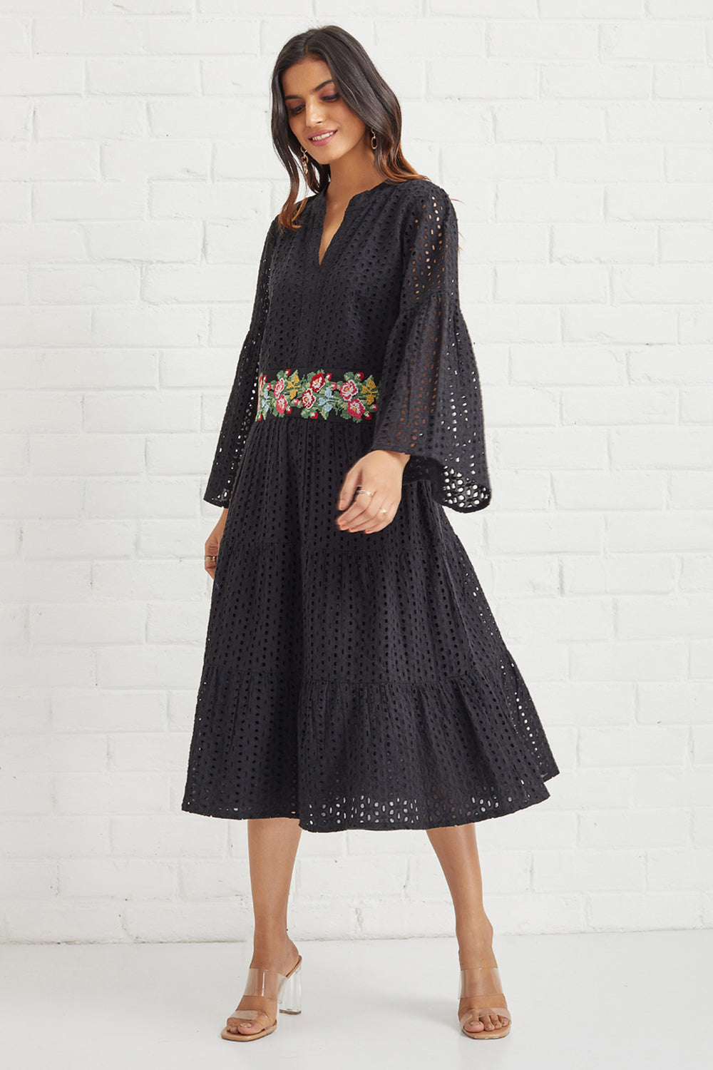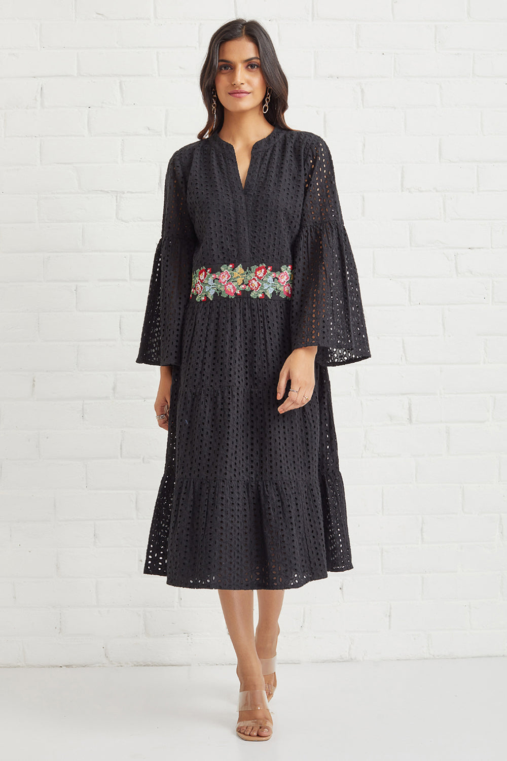 Enchanting multi -color floral embroidery on the waistline .Featuring a flowy fit ensures the versatility of the dress.It brings a hit of drama to lounging or dining with your loved ones.