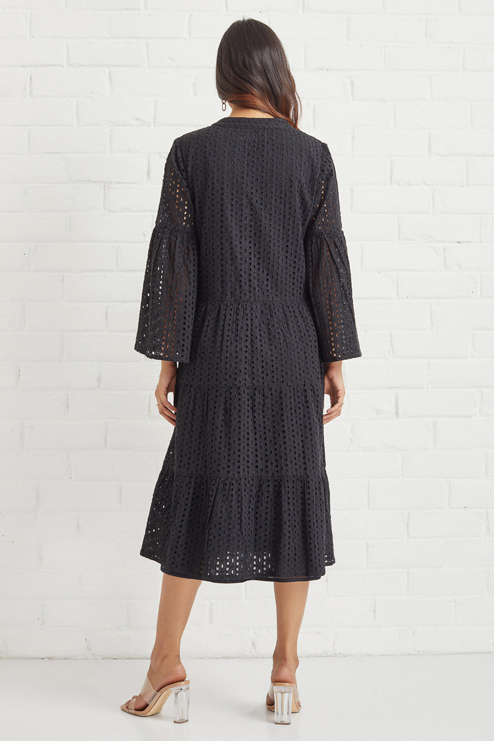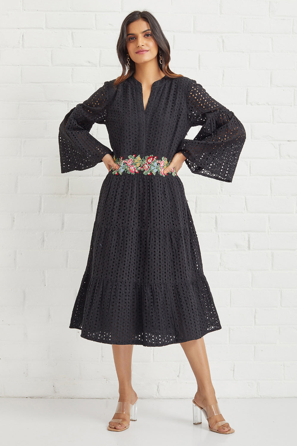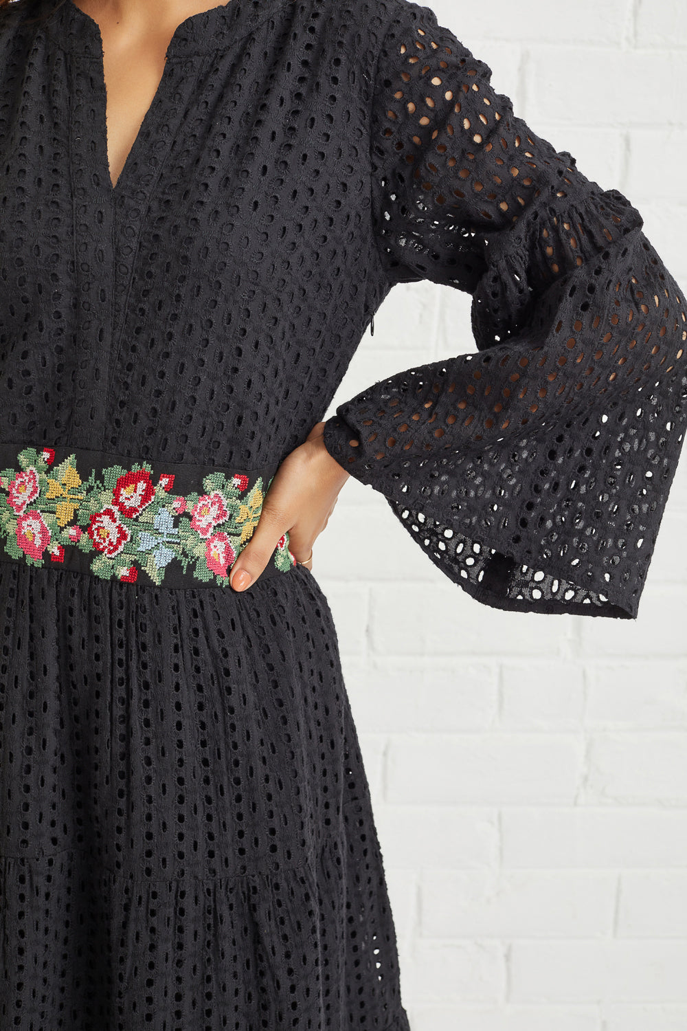 Enchanting multi -color floral embroidery on the waistline .Featuring a flowy fit ensures the versatility of the dress.It brings a hit of drama to lounging or dining with your loved ones.