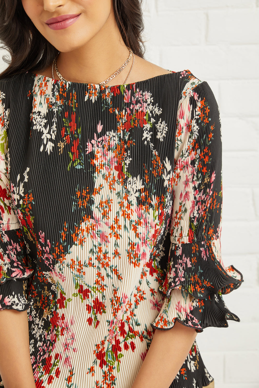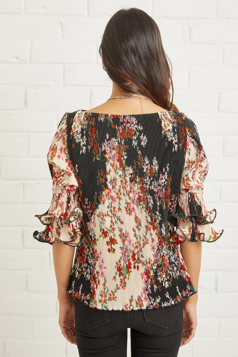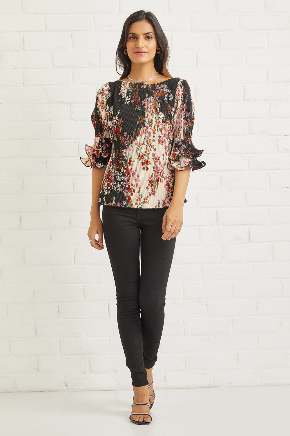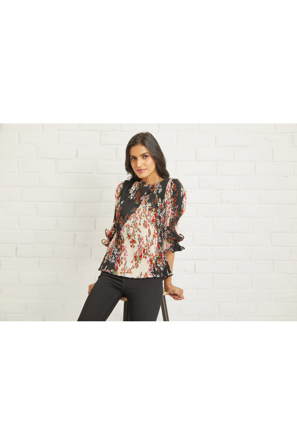 Precious pleated enchanting floral blouse with pretty frills.Pair it with your favourite denims for a polished ensemble