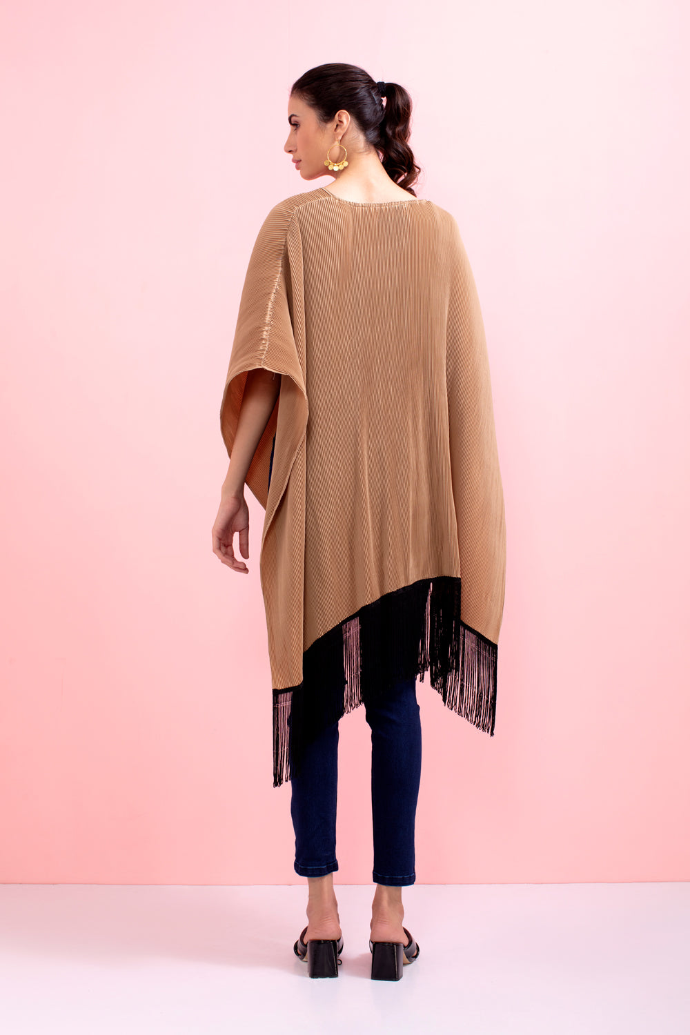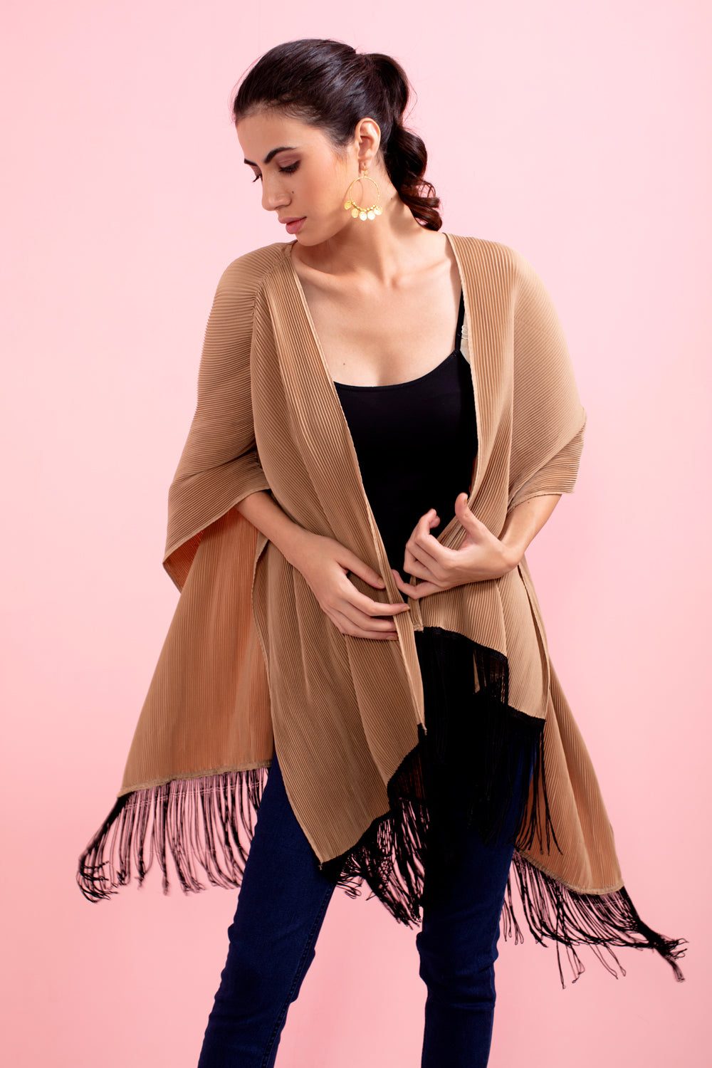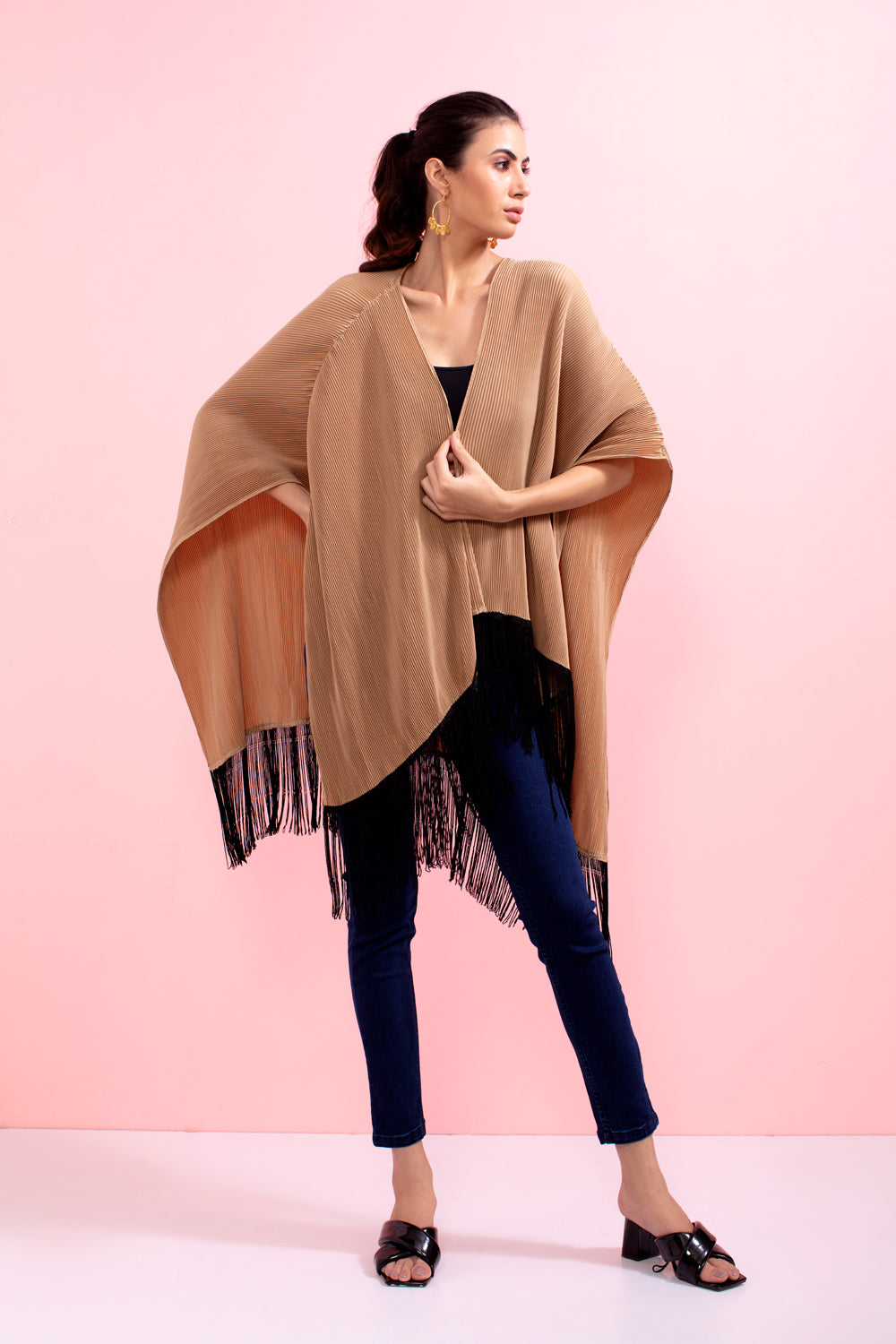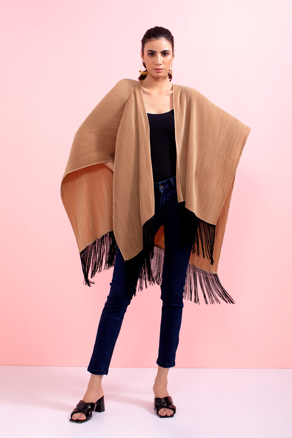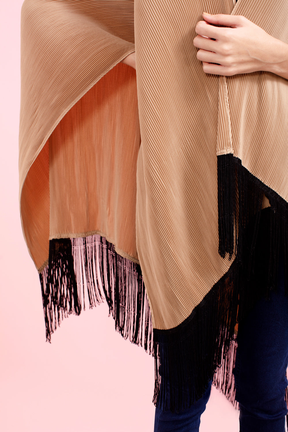 Tassel trim and oh so so-polished fine pleats ,this cape is a feminine essential