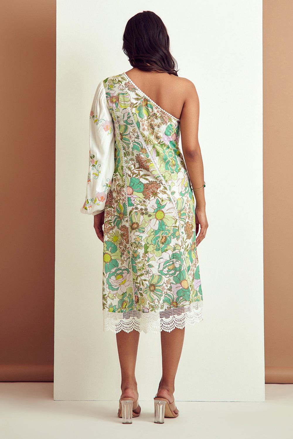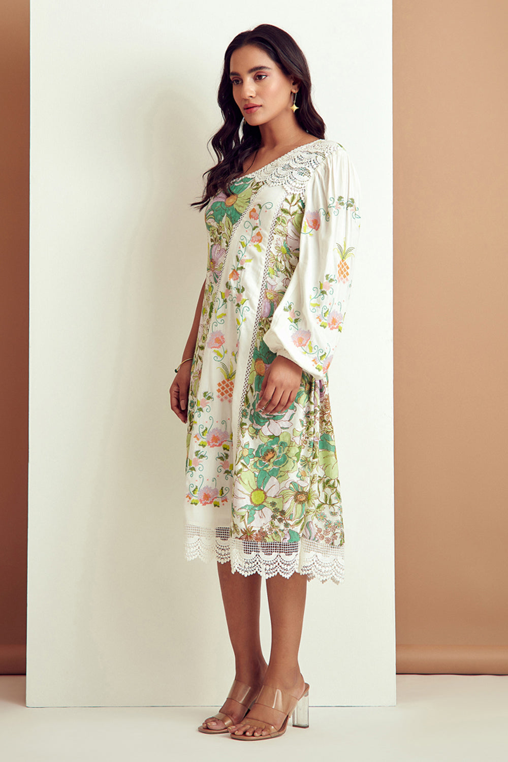 Redefined and flattering,Structured yet delicate .Beautifully crafted pastel embroidery and abundance of lace, mixed print makes this dress a heads turning statement