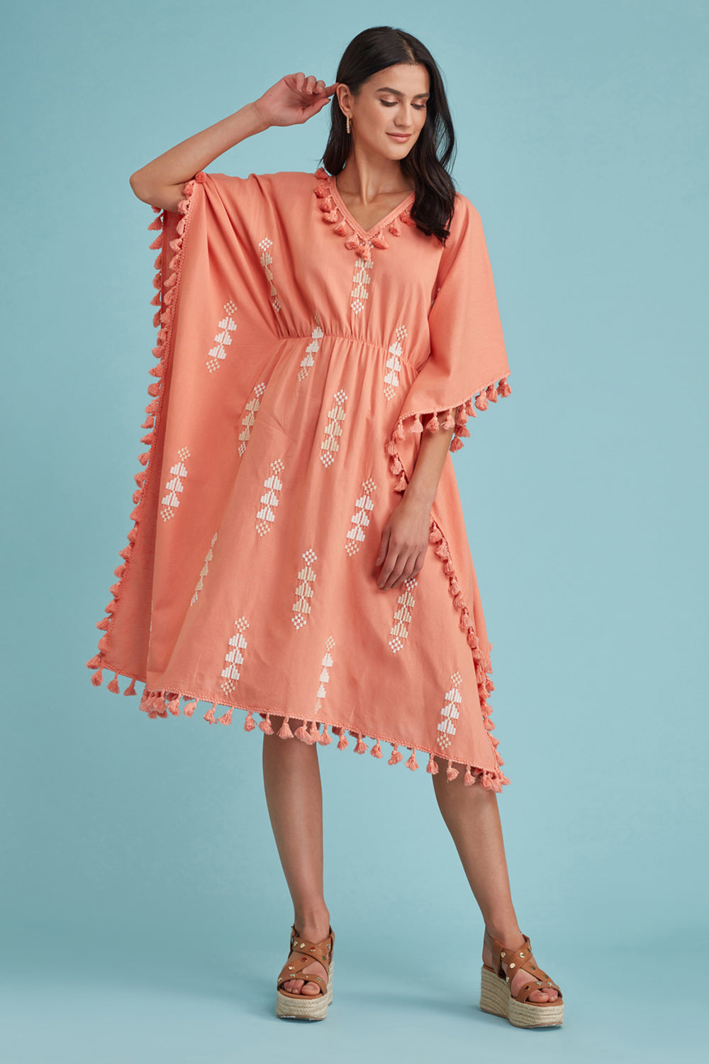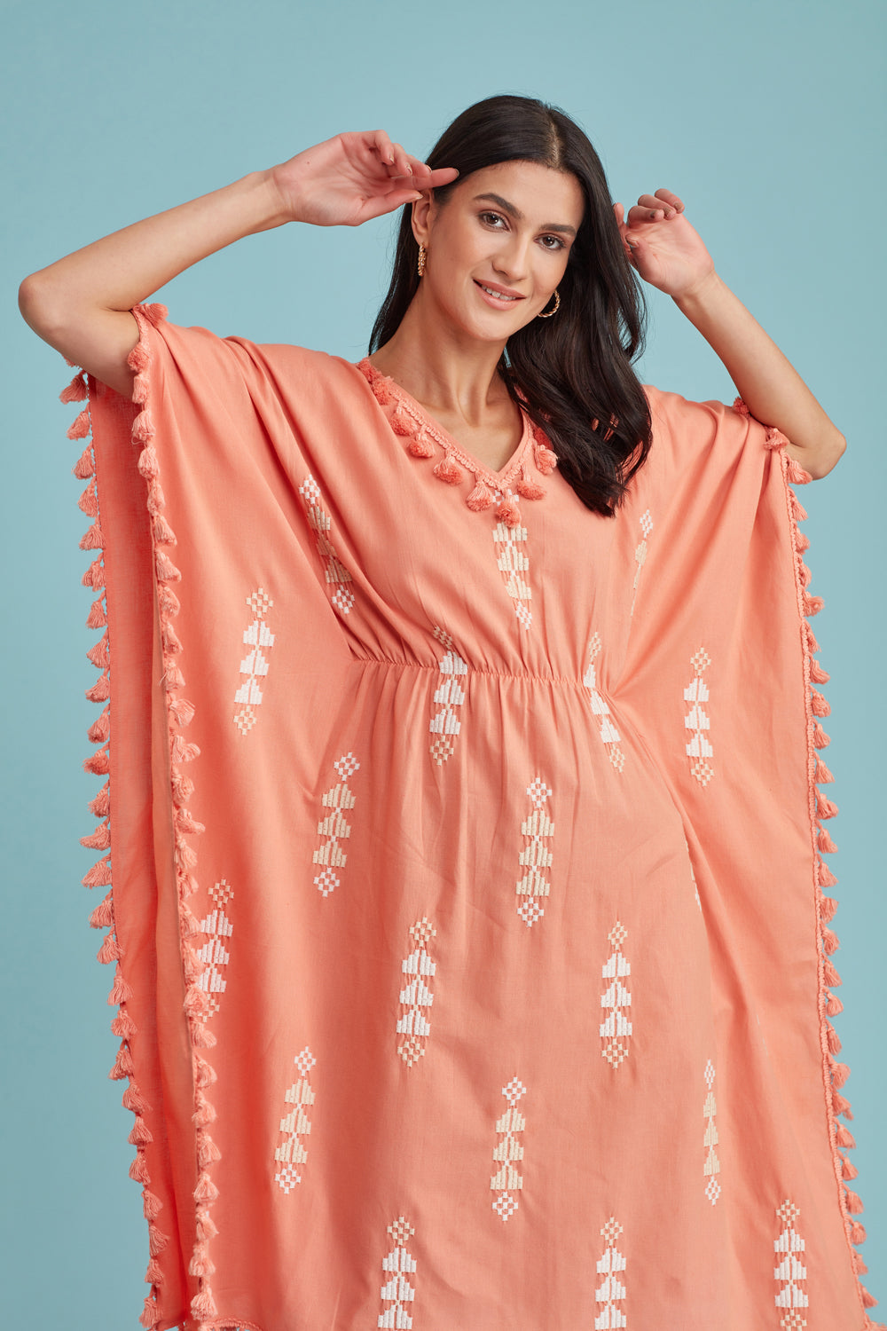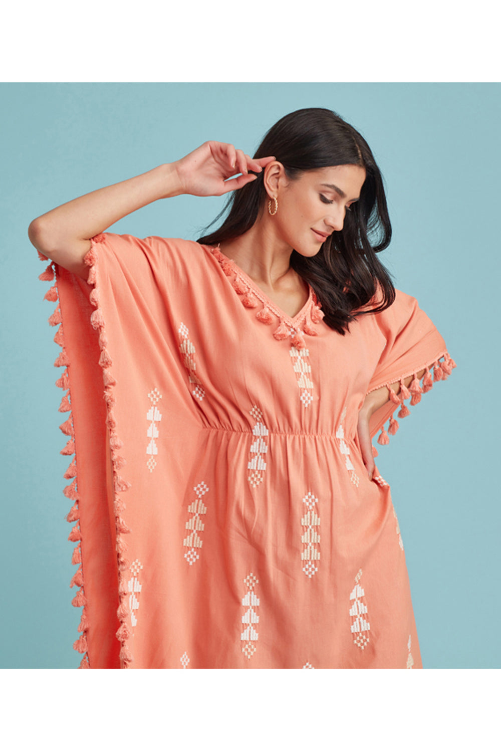 All over embroidery lends this midi kaftan an air of breezy elegance.