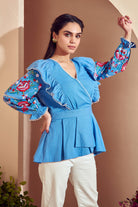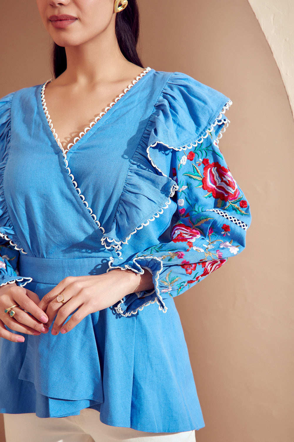 This collection showcases modern woman's inherent feminity and strength. Adorned with bouquets of springtime 's most fabulous embroidery makes this blouse a gorgeous piece for your summer wardrobe.