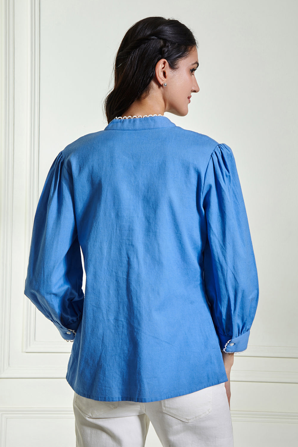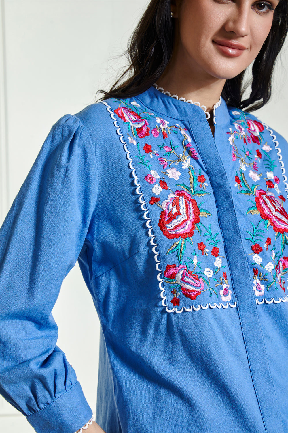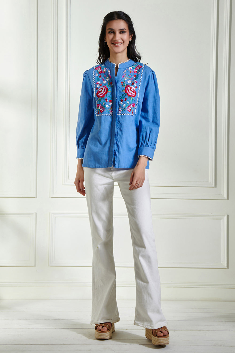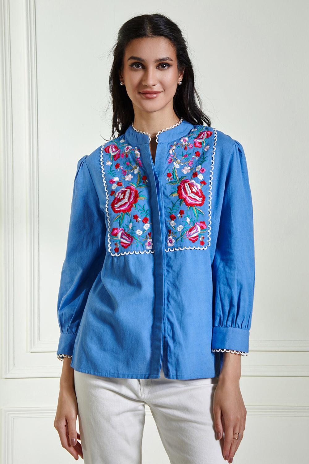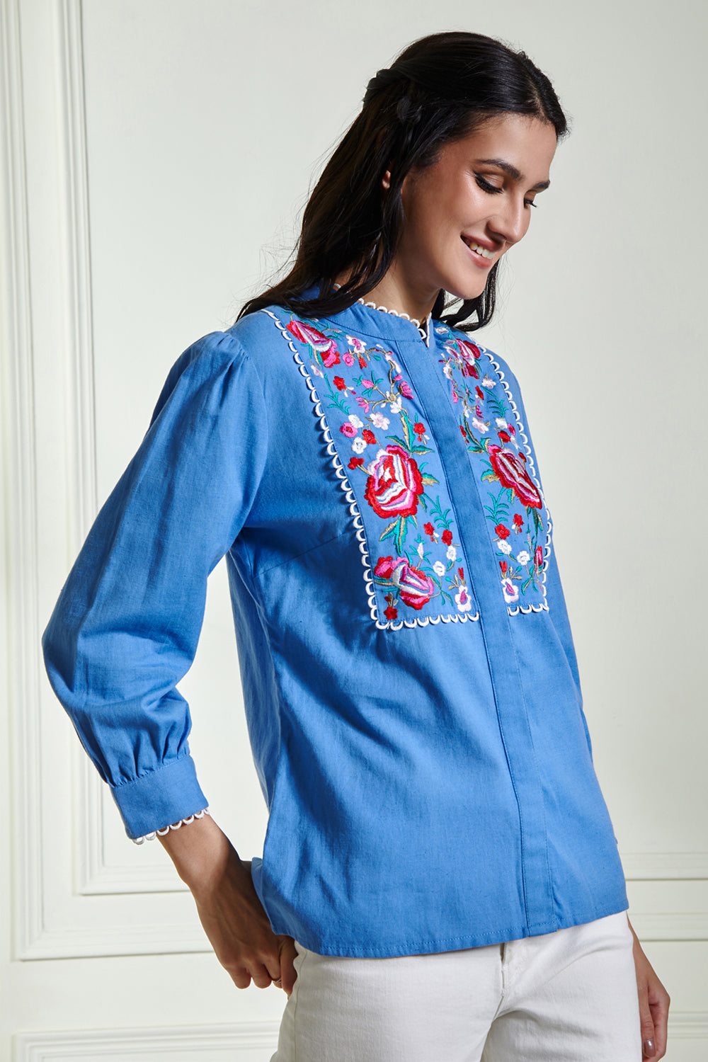This collection showcases modern woman's inherent feminity and strength. Adorned with bouquets of springtime's most fabuolus embroidery makes this blouse a gorgeous piece for your summer wardrobe.