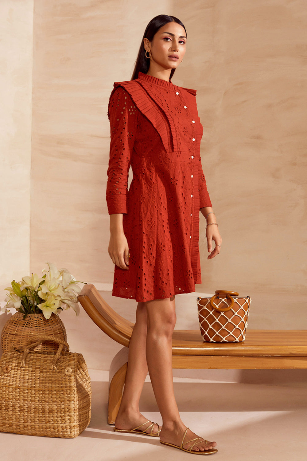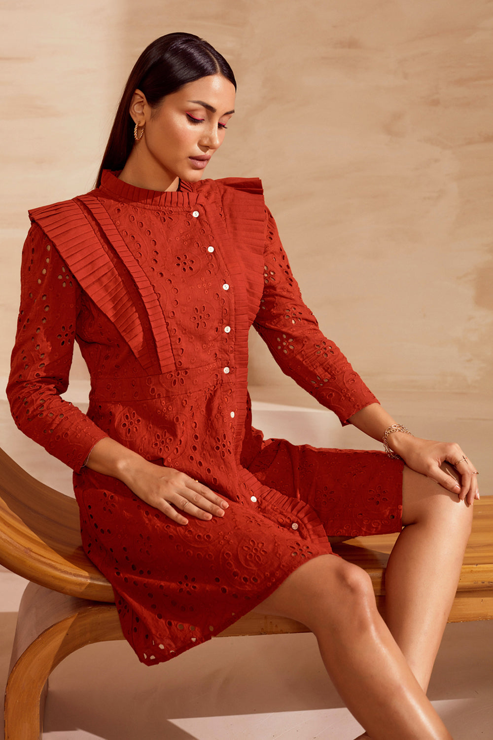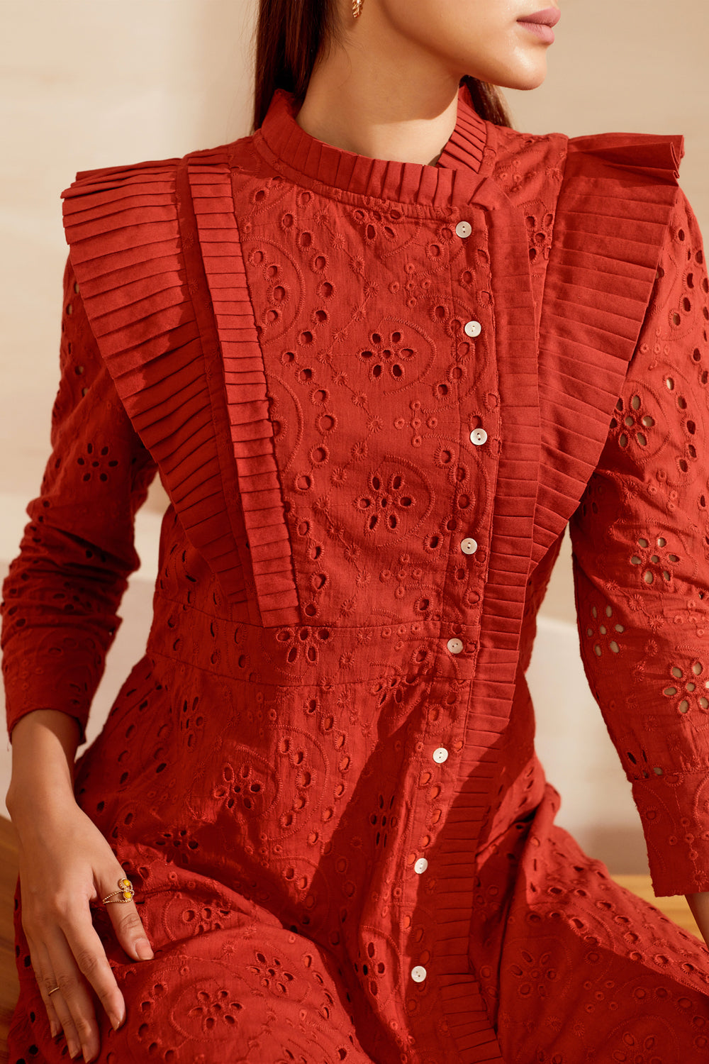 From its structured sleeves to the detailed pleated finish, this stunning eyelet lace dress is a study in dainty details.