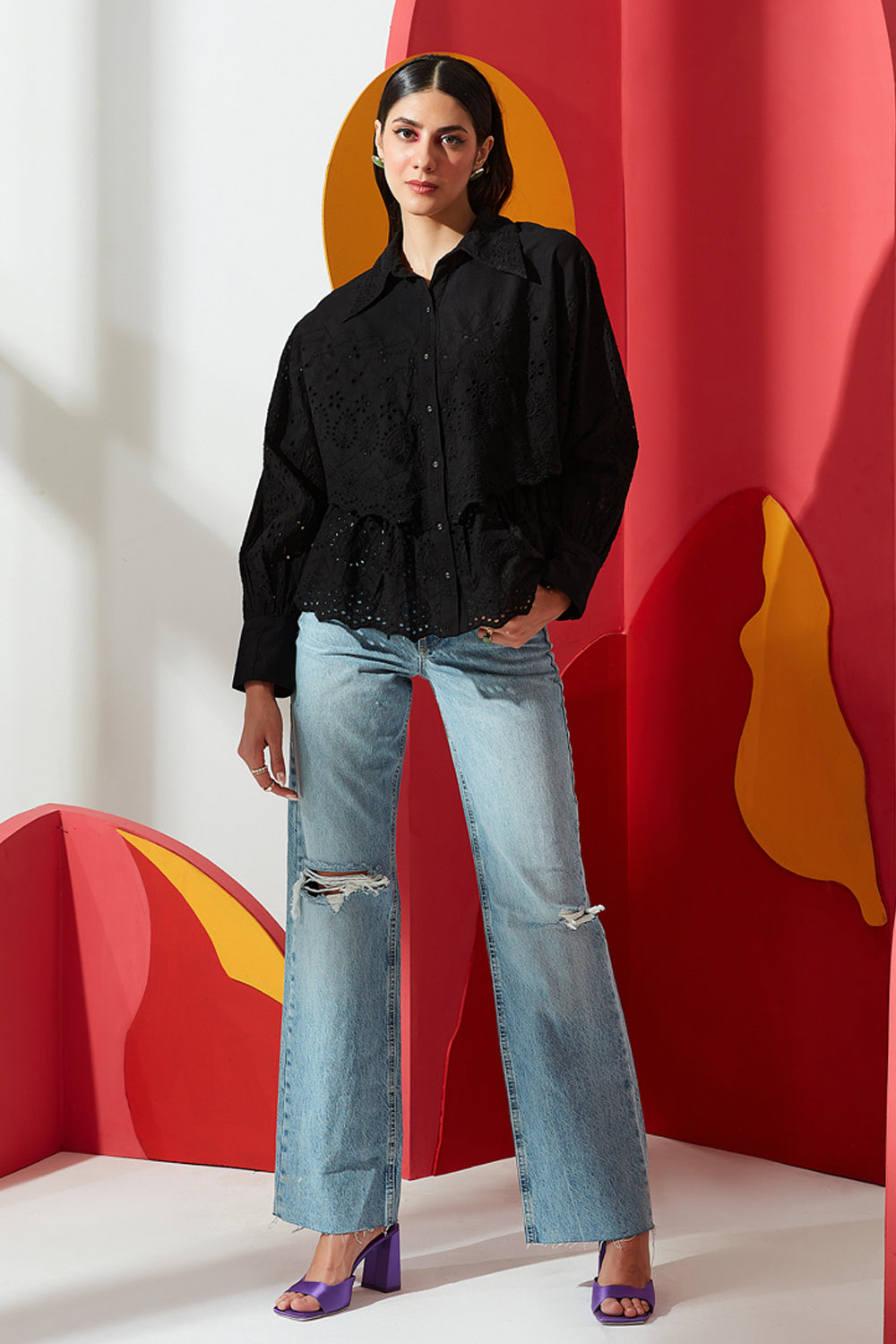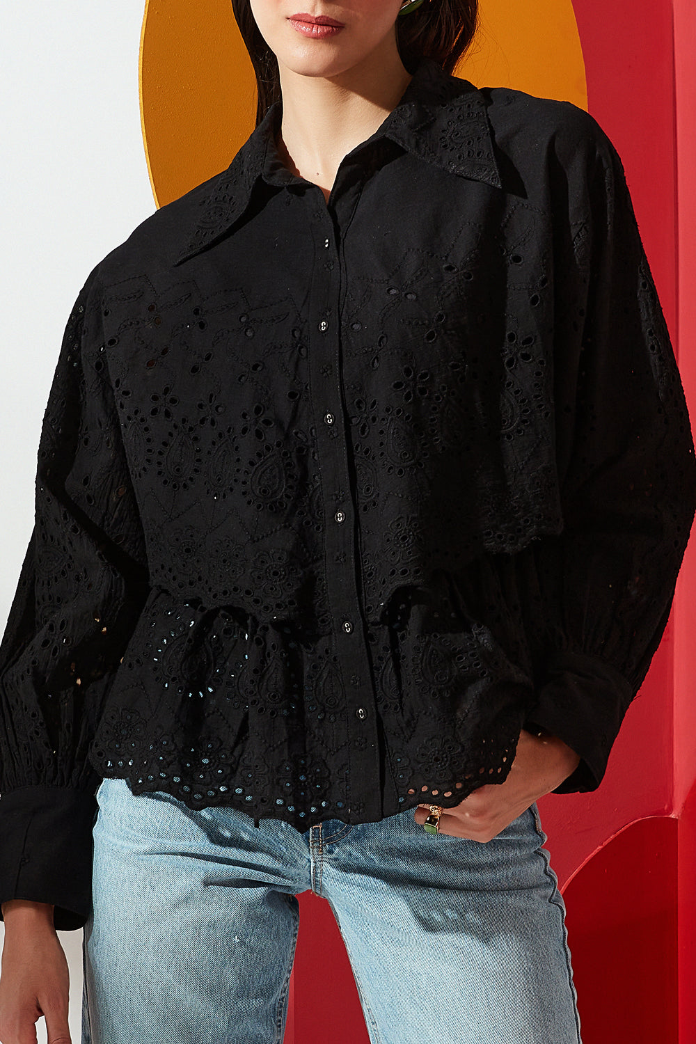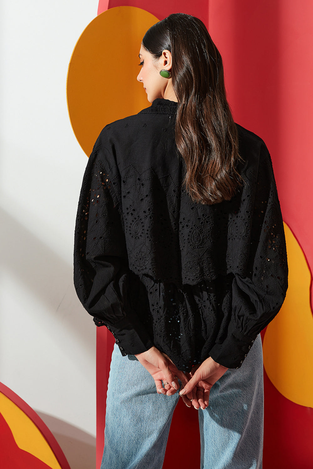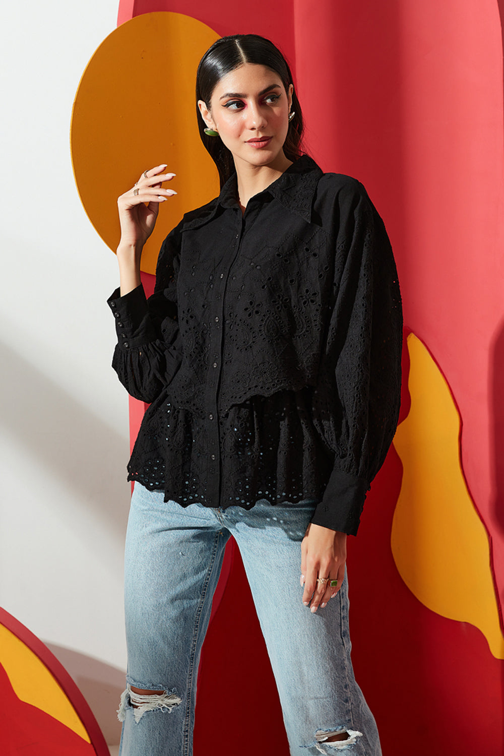 This shirt has detailing of embroidery and cutwork and features an over lay. It's crafted in cotton with a classic collar, detailed with a delicate lace trim. Balloon sleeves with cutwork embroidery makes this blouse a must have.