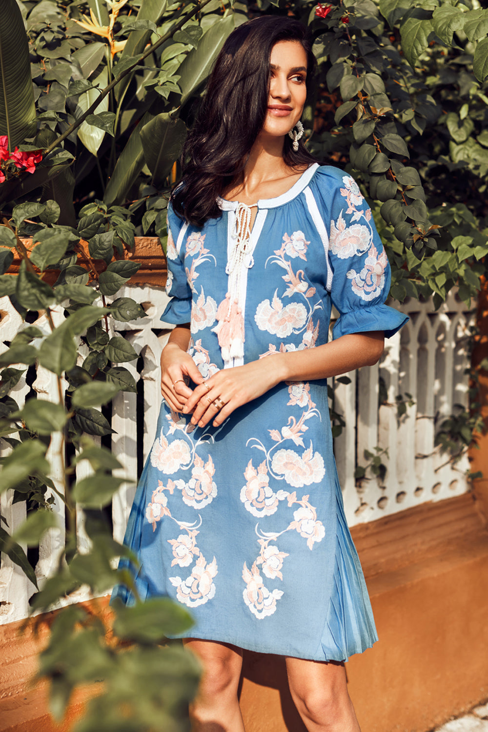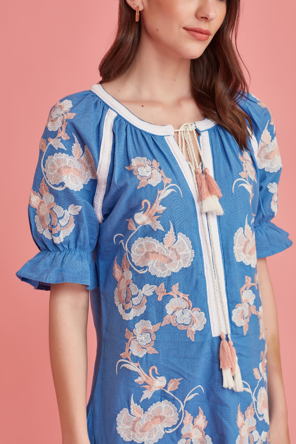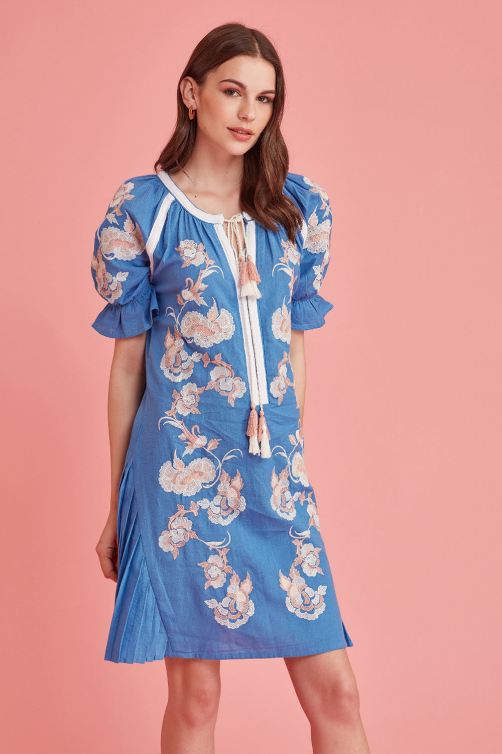 With a dreamy palette, glimmering threadwork. Feminine, Effortless style, great attention to detail. The exquisite embroidery makes this dress a must have in your summer wardrobe.