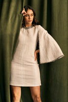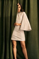 Tweed cape sleeved dress detailed with a shimmer tweed lace and pearls for that perfect winter brunch.