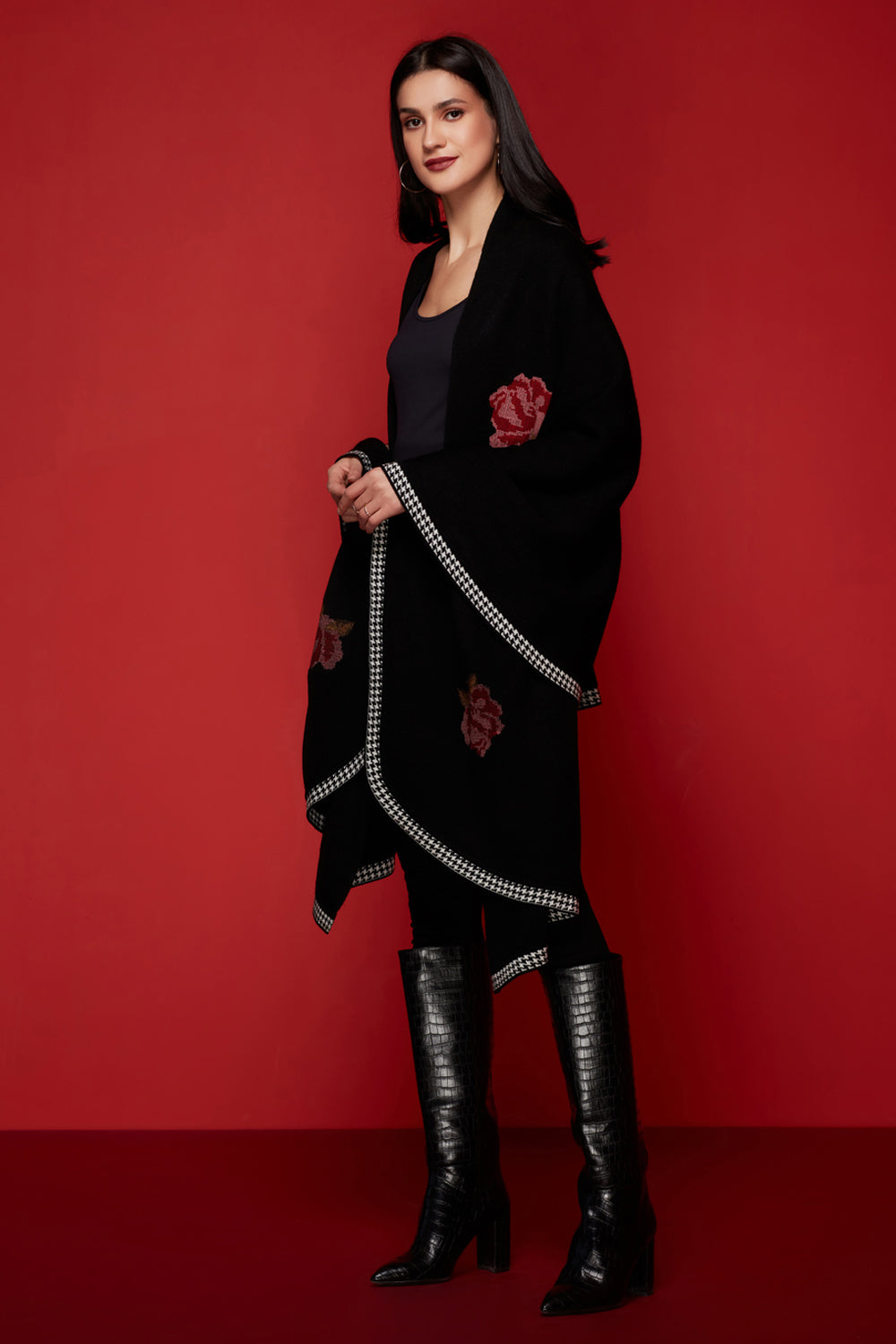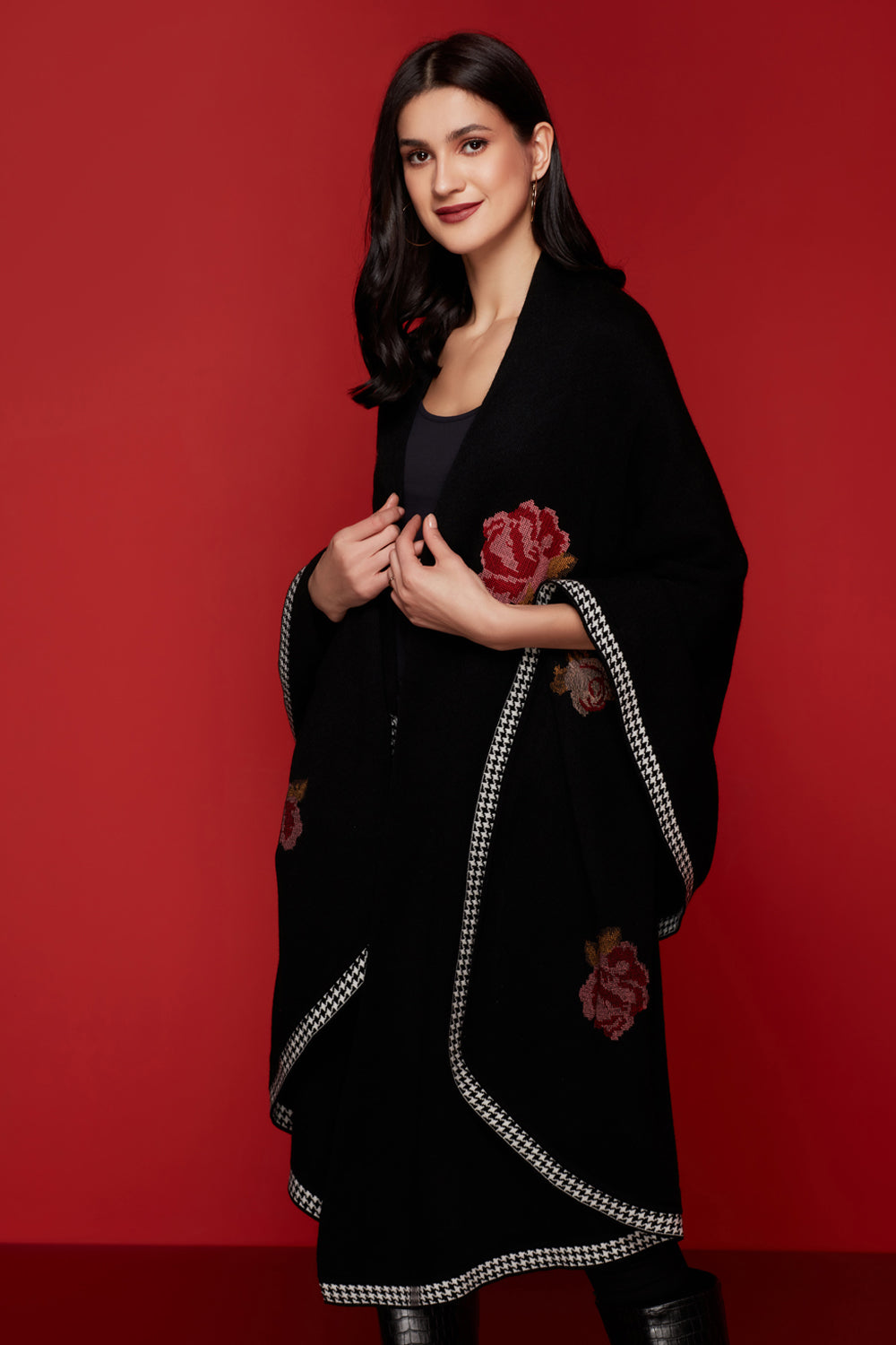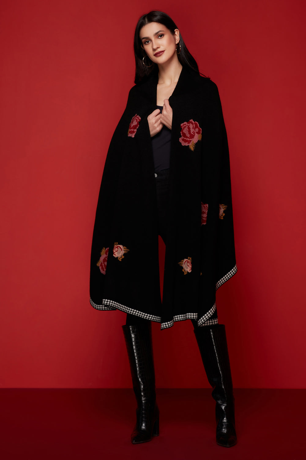 Cross stitch floral embroidered woollen cape for a polished ensemble