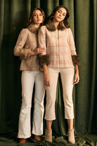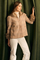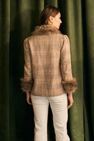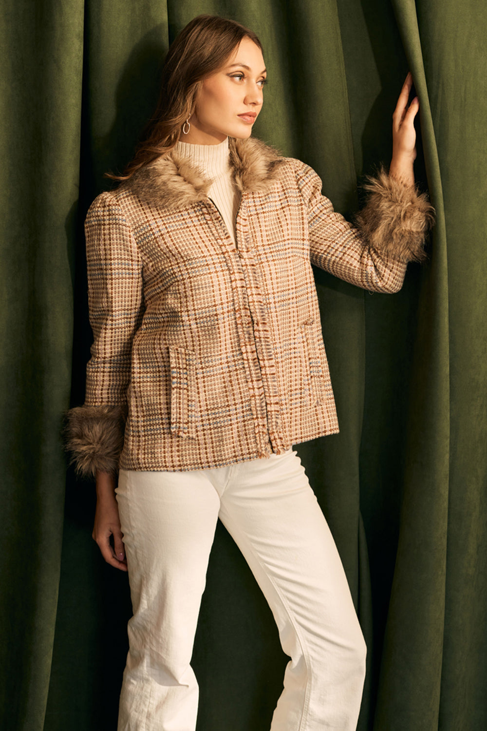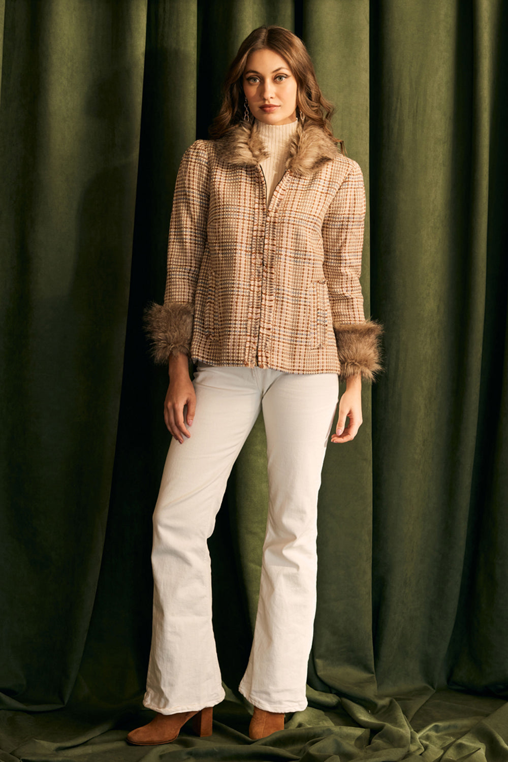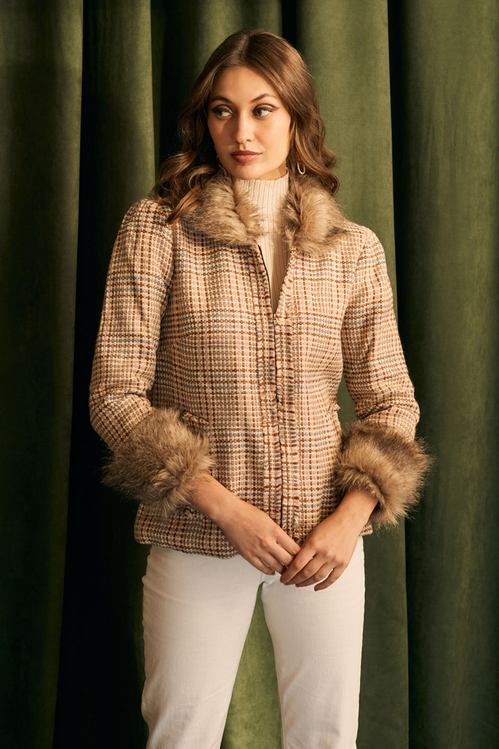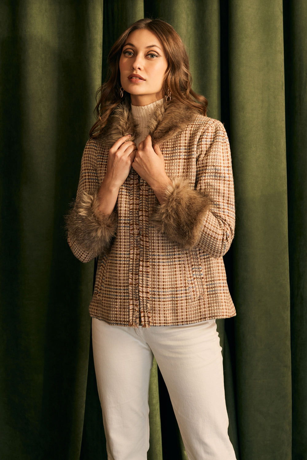 Tweed jacket detailed with fur for that perfect winter brunch.