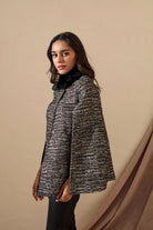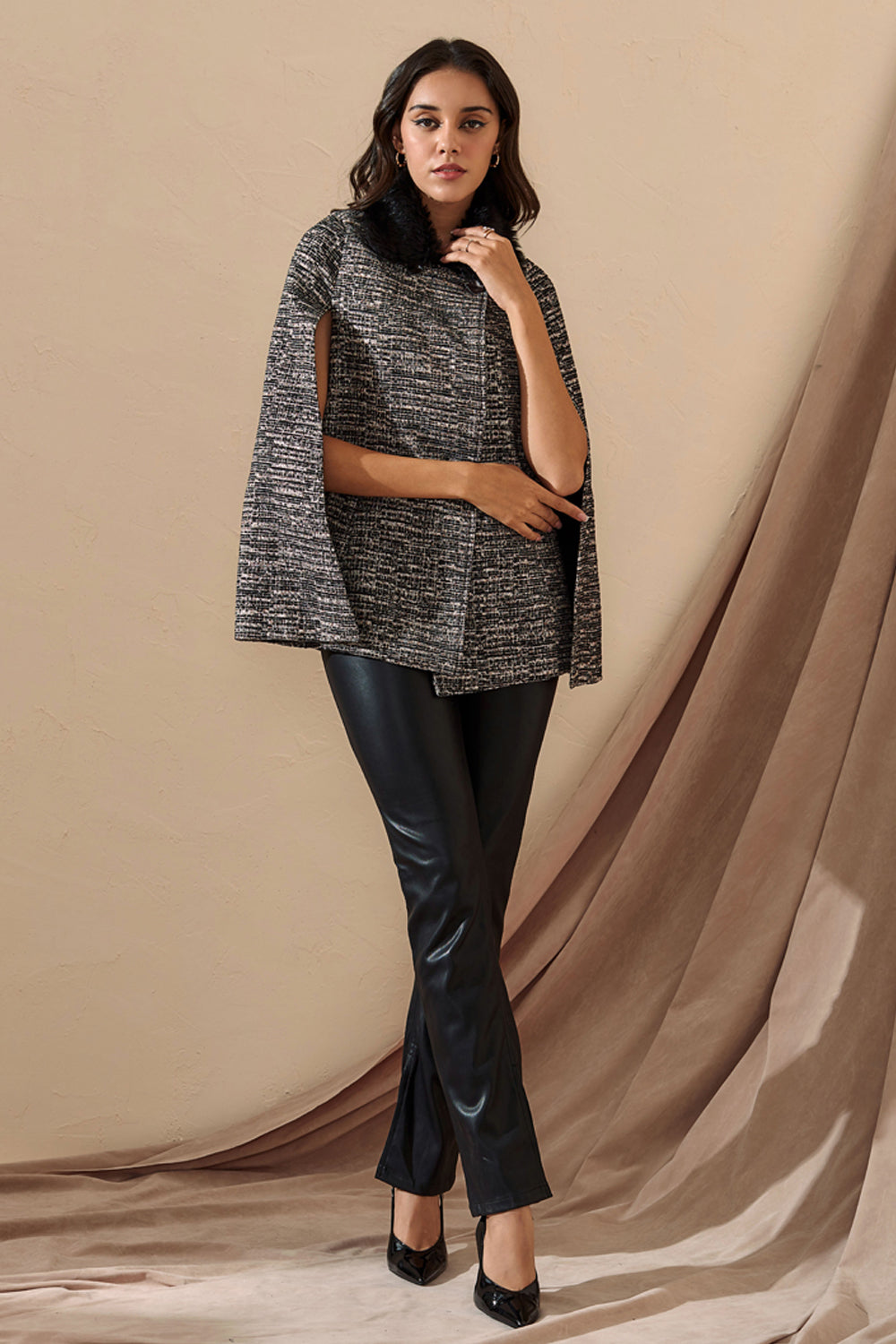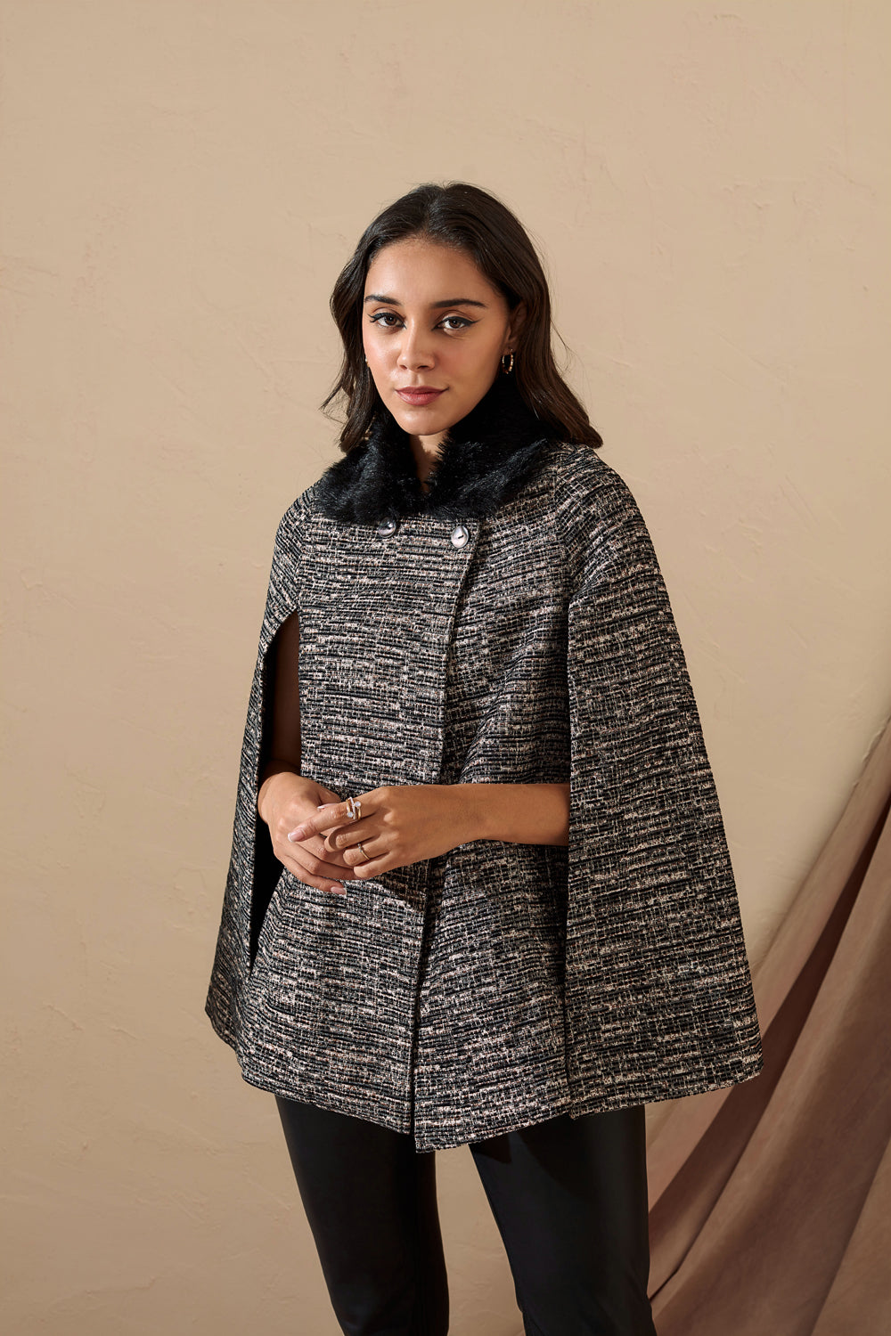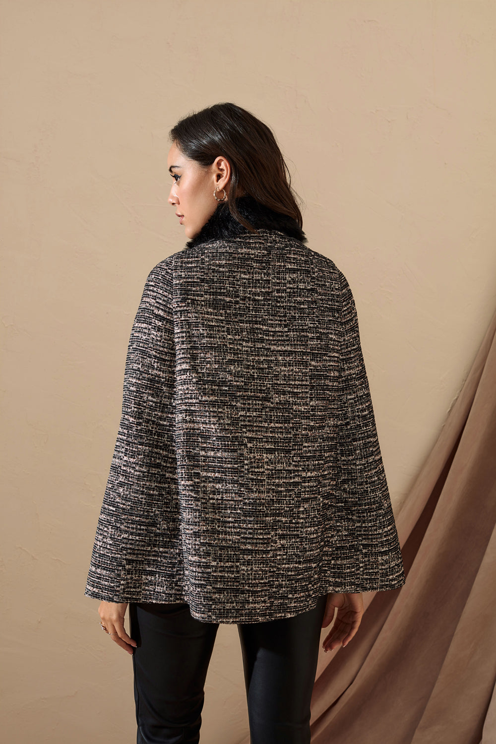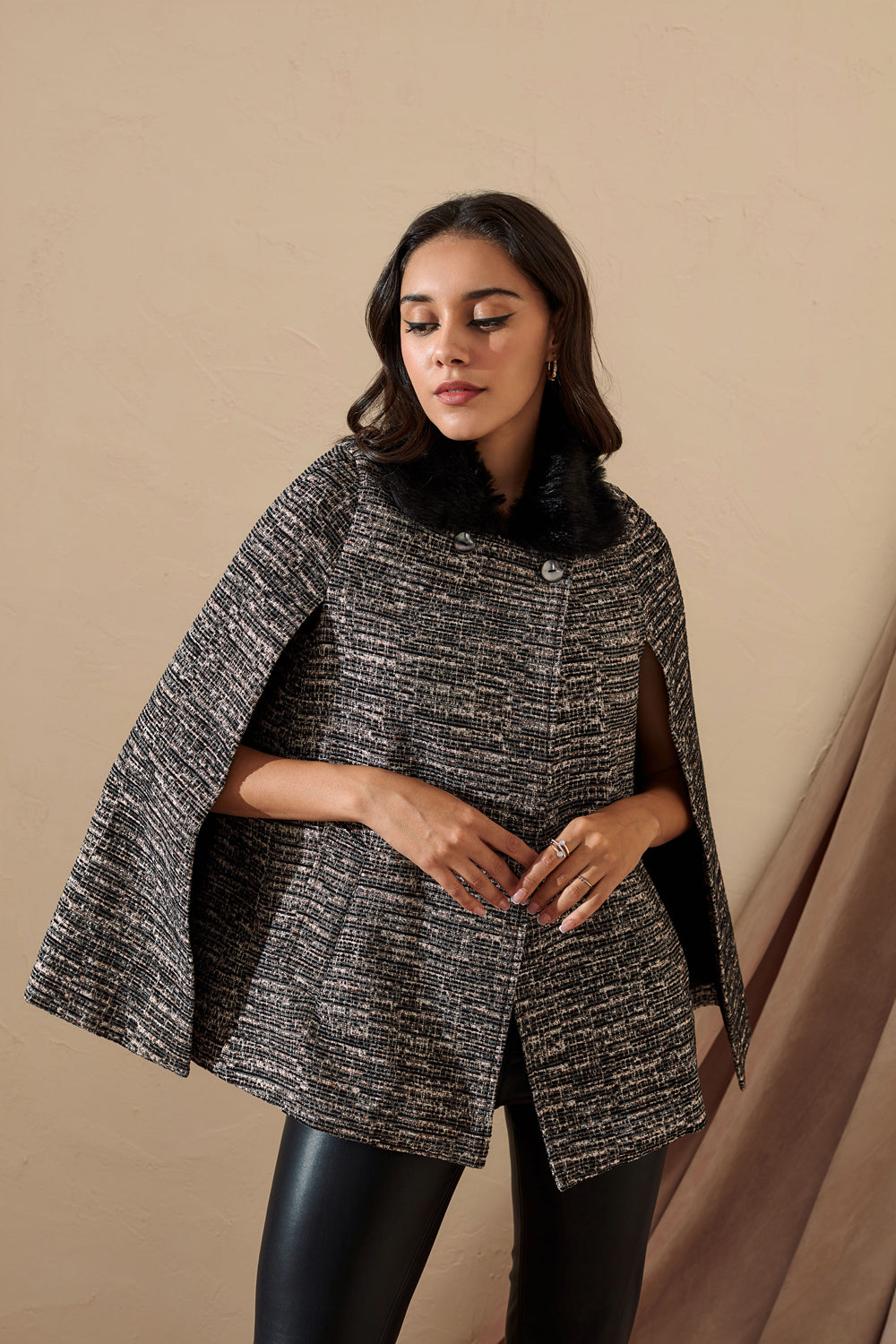 Tweed cape coat detailed with fur for that perfect winter brunch.