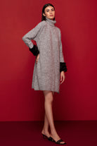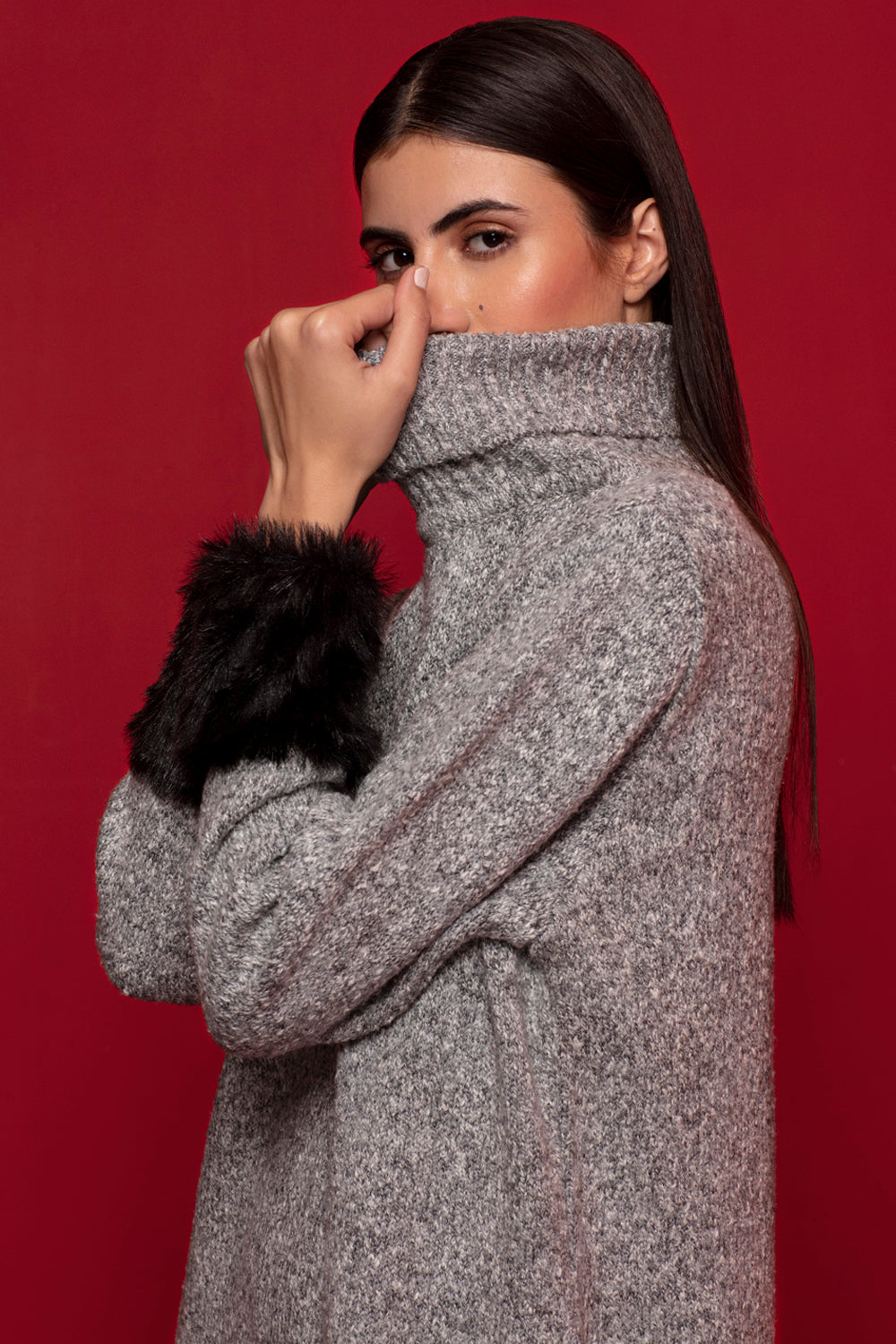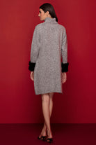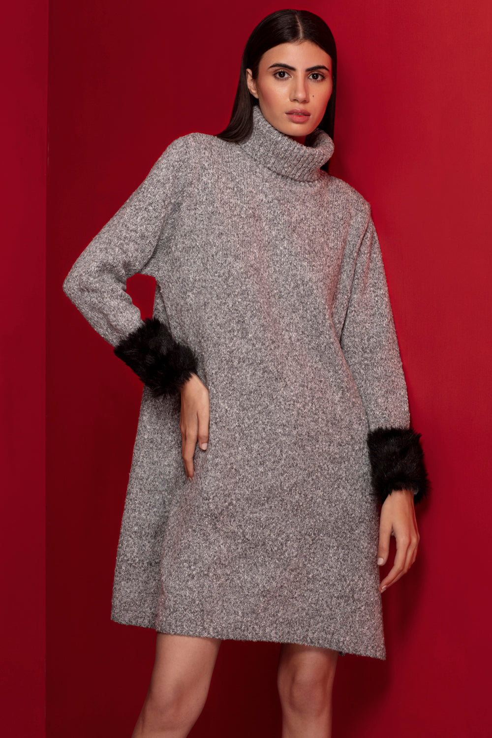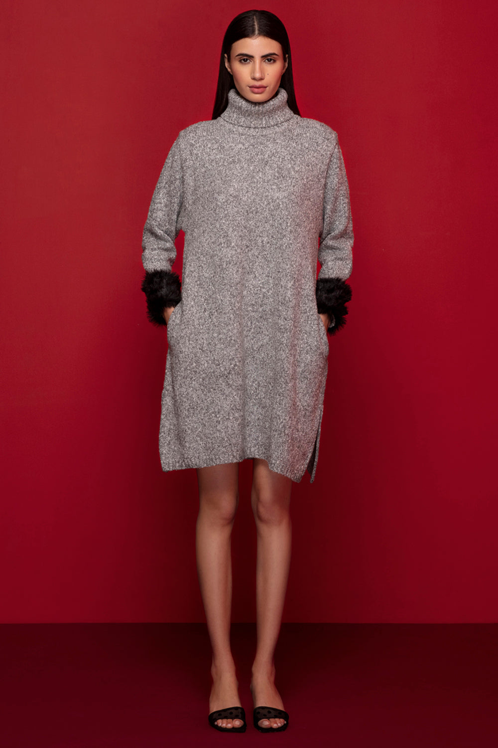 Fur trimmed knit sweater dress. Pair it with knee high ankle boots for a polished ensemble.