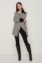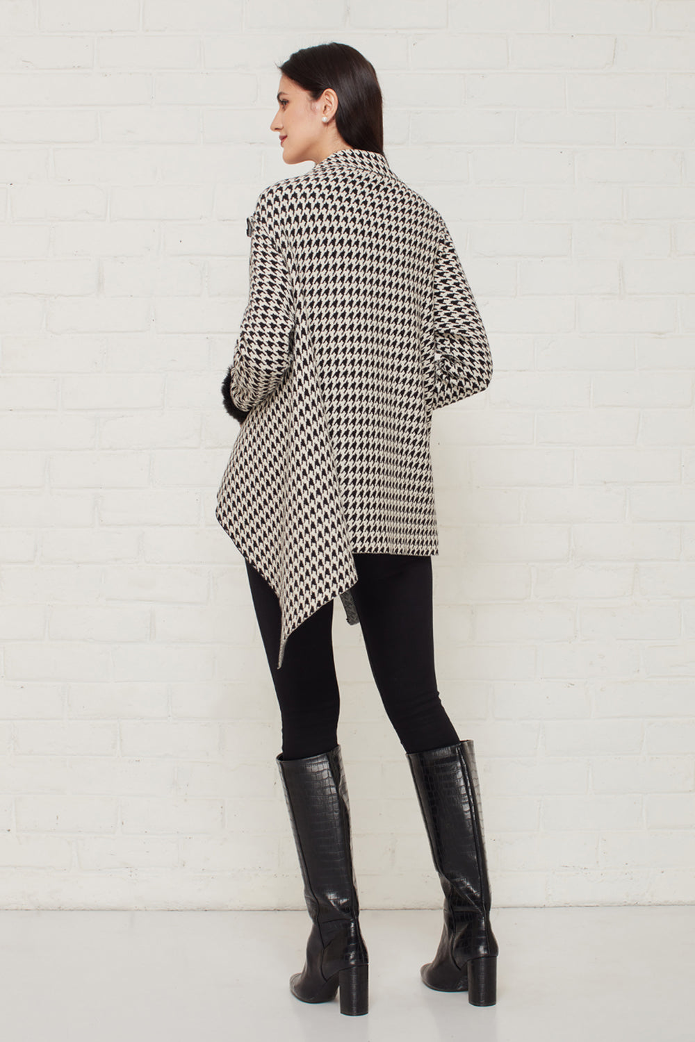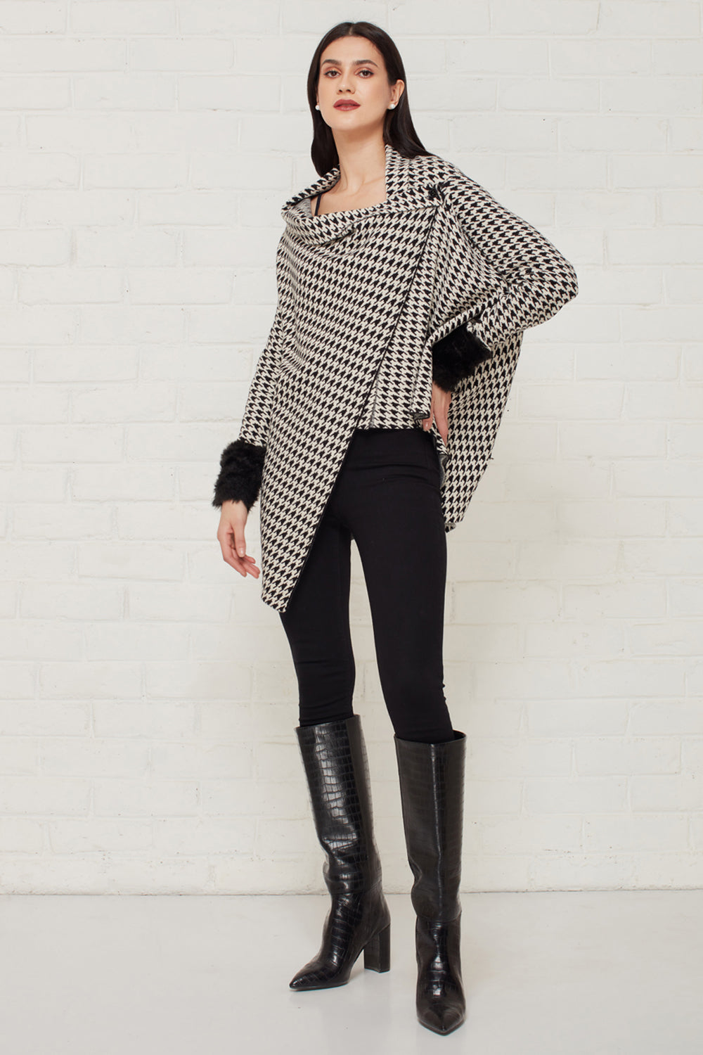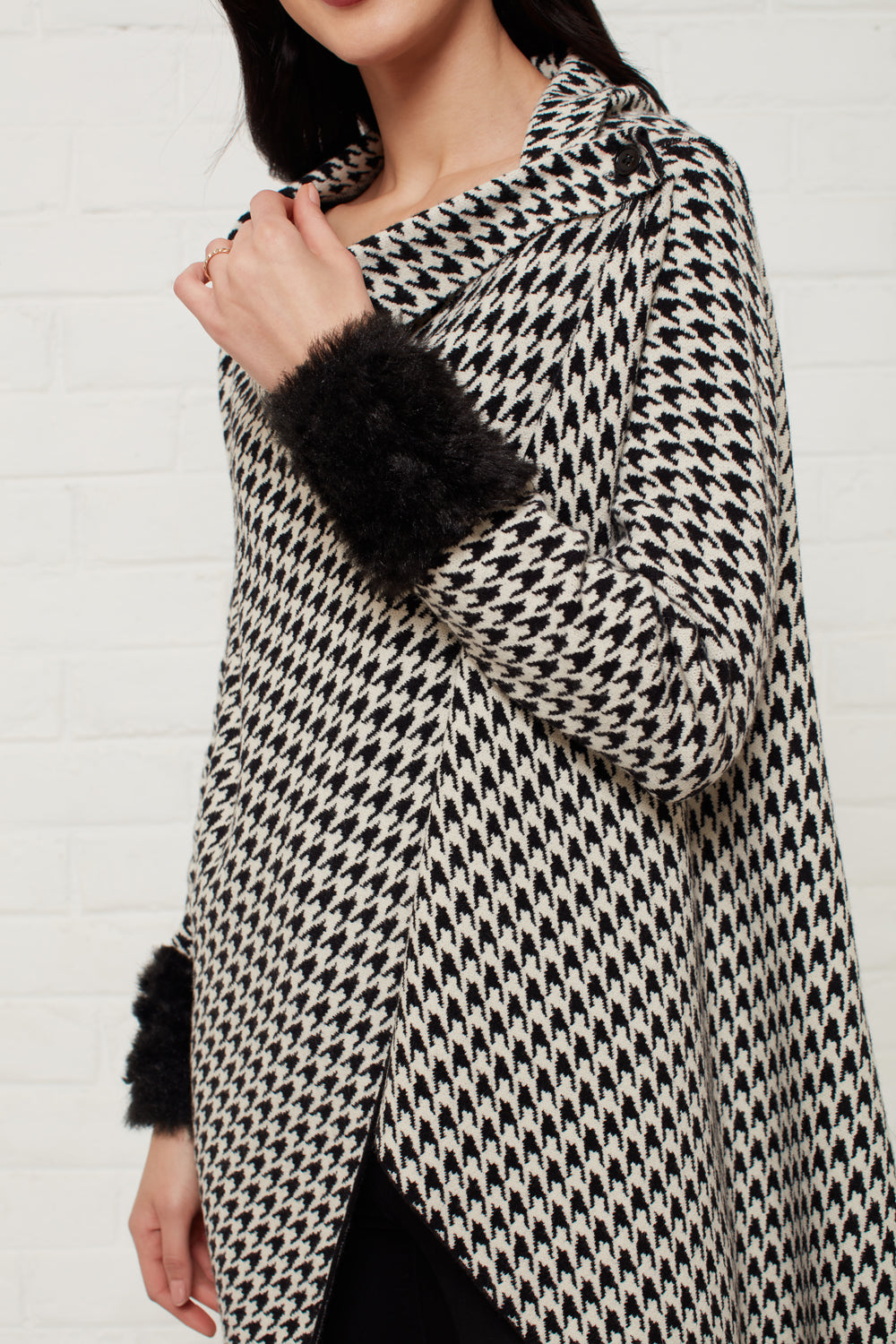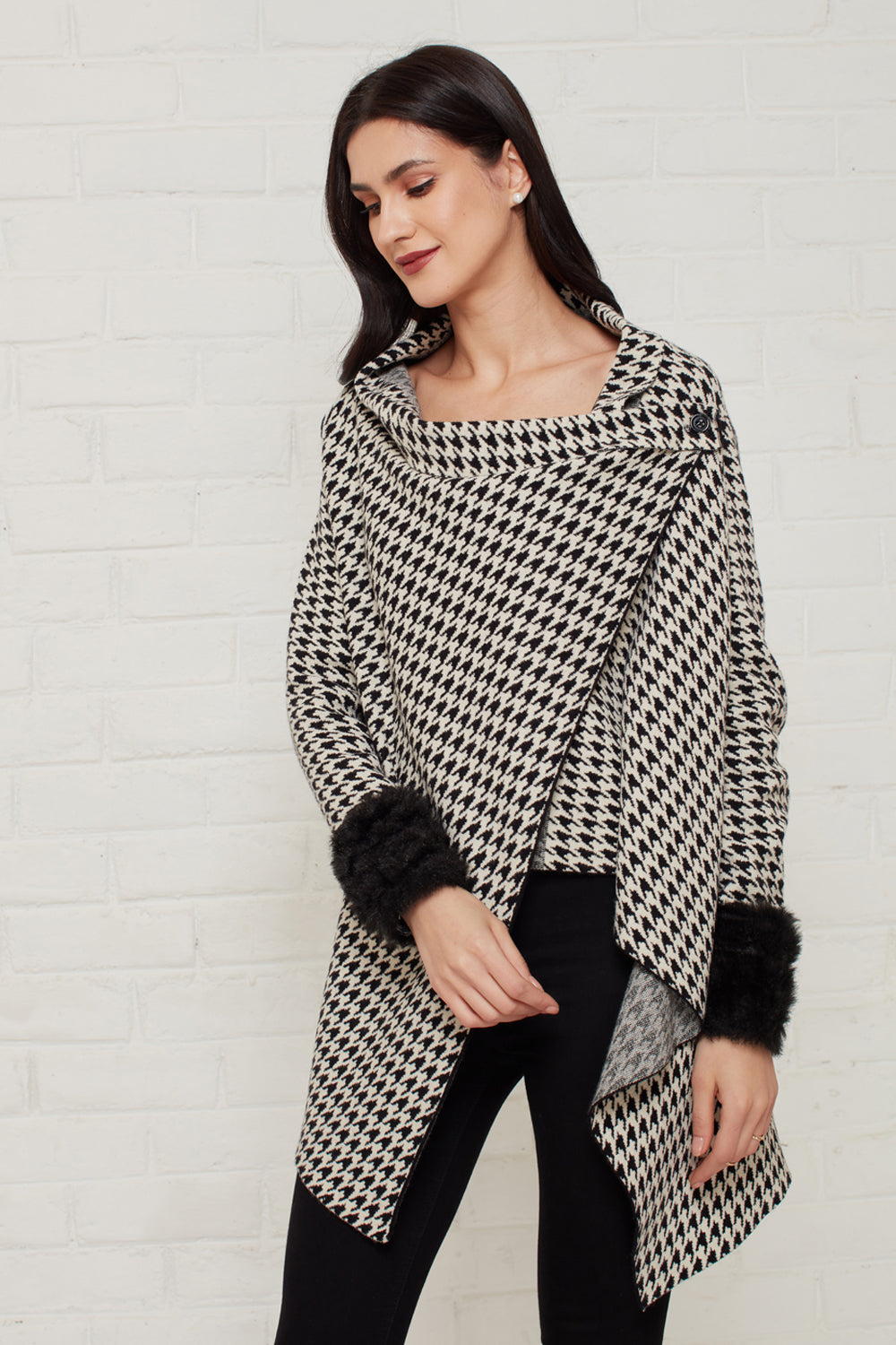Monochrome houndstooth knit sweater with fur trimmed sleeves. Pair it with skinny jeans and ankle boots for a perfect wintery ensemble.