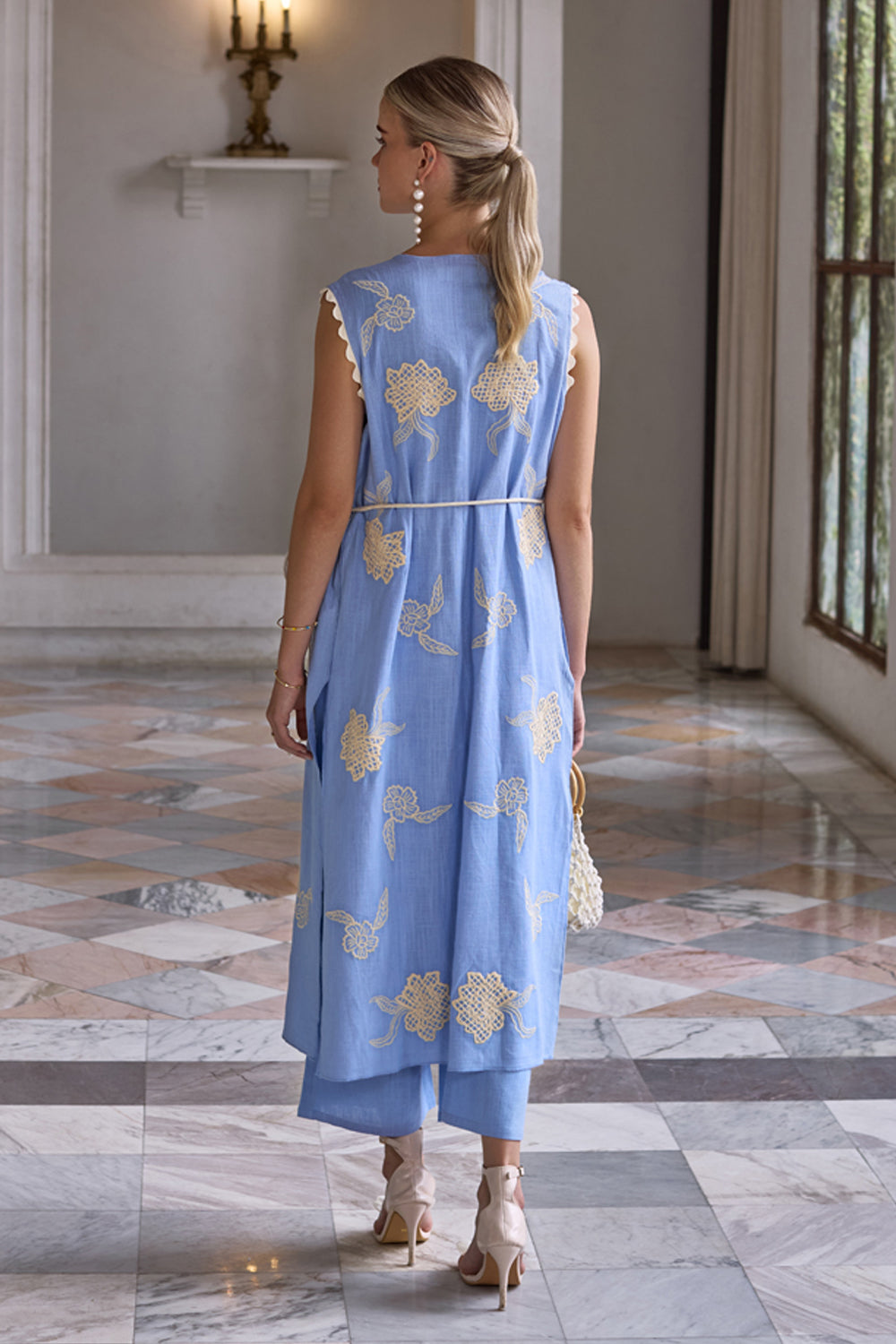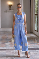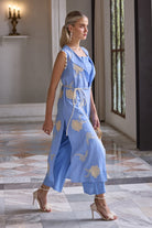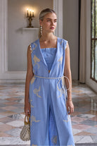 Crafted in premium linen with exquisite honeycomb embroidery. This coord set comes with a bustier, overlay jackets and pants.Perfect for a summer vacay.