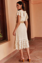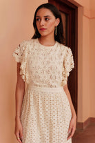 The creme guipure appliqué on bodice and mix and match eyelet lace skirt, needs no introduction with its one of a kind fabric in a classic silhouette to you from chic events to brunches and every moment in between. So bring your bold shoes and accessories to keep your new fave dress company and get ready to drop some jaws everywhere.