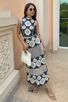 Refined and flattering. Structured yet delicate. Beautifully crafted in fine tencil with honeycomb embroidered flower all over on the blouse and the skirt makes this matching set extra ordinary.