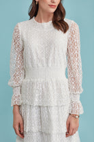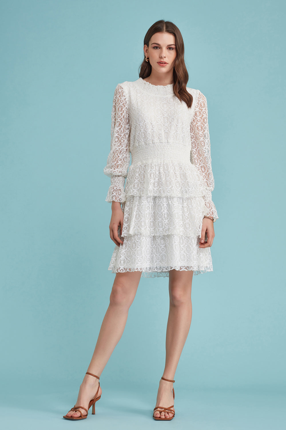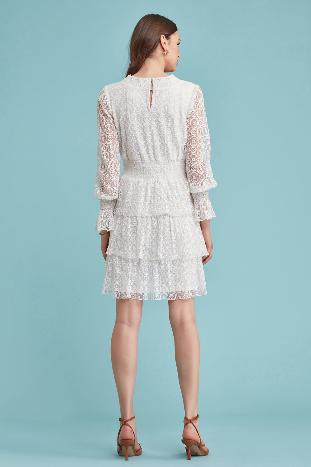 Dainty lace dress with ruffles on the sleeves and shirred waistline. Elegant and ever classic.