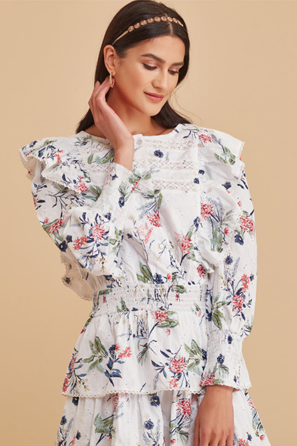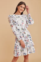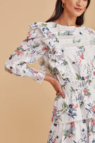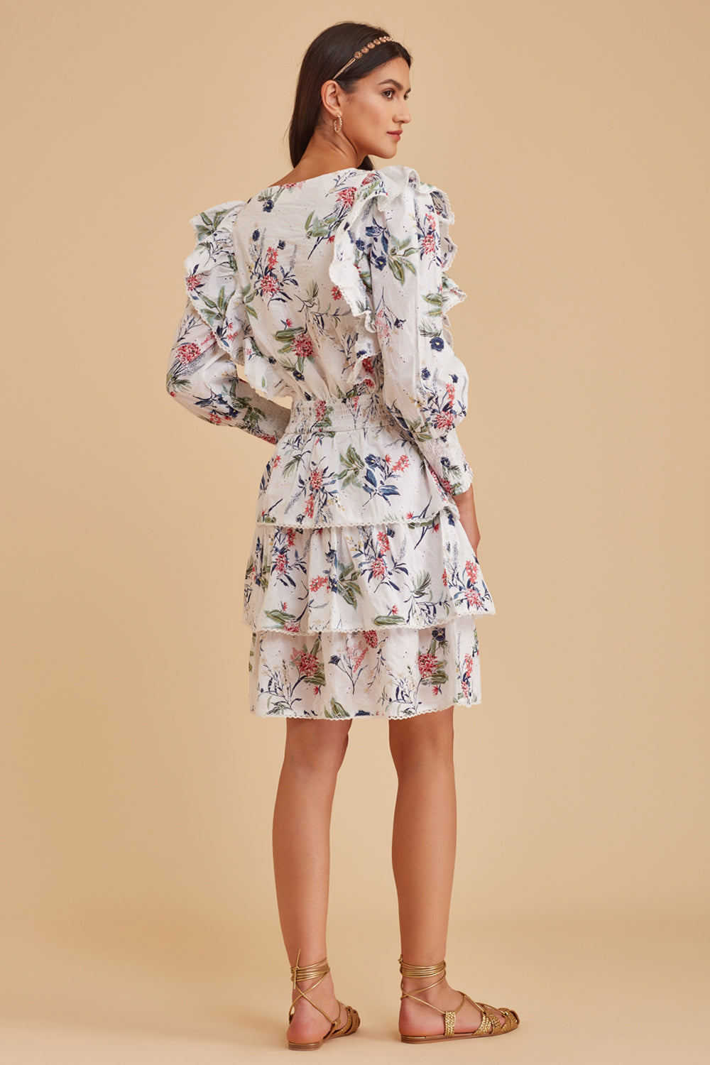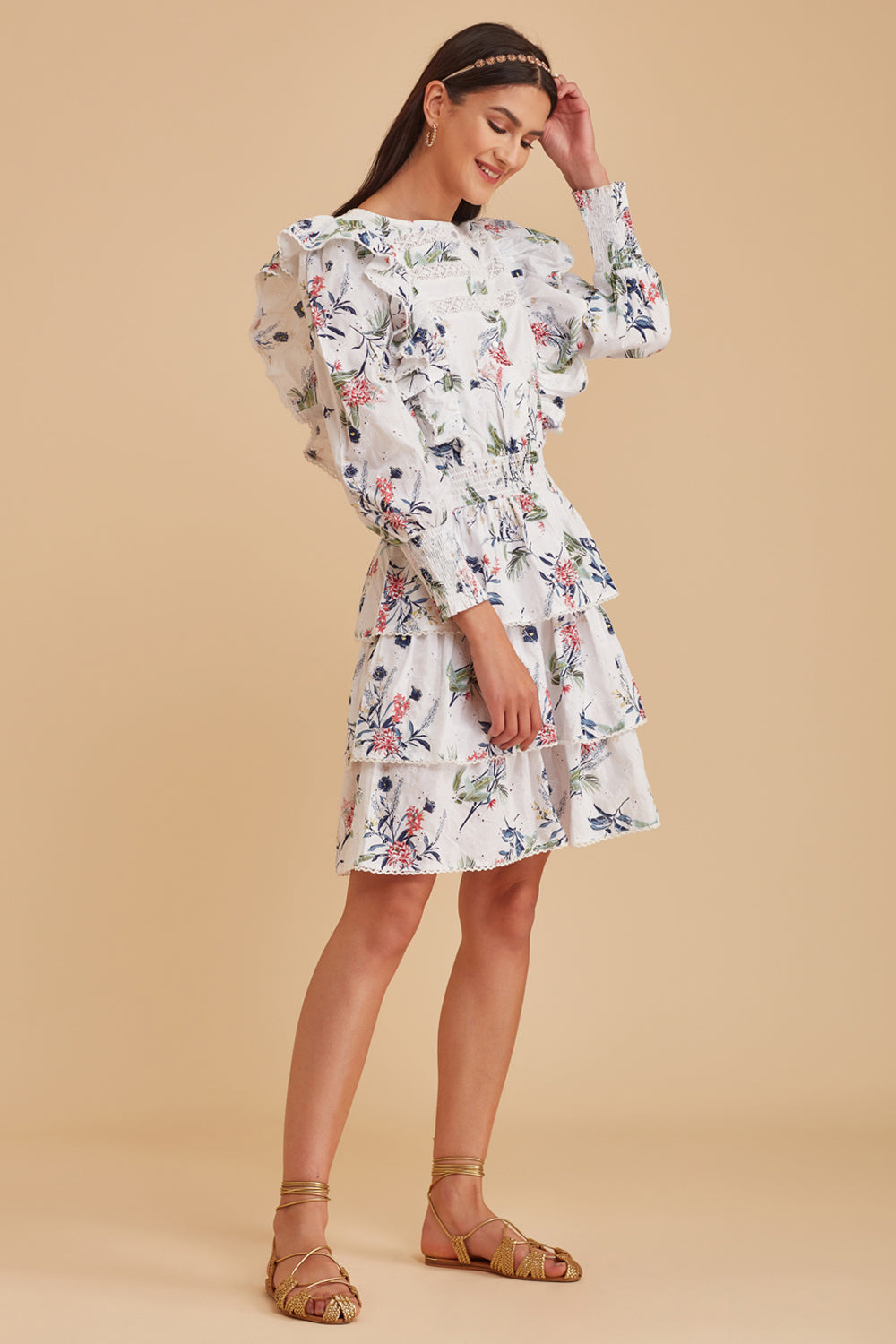Beautiful broderie layered printed dress. Featuring ruffles and lace trims. We love sporting its dainty print.This style is simultaneously fashion forward and vintage inspired