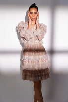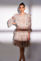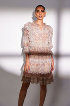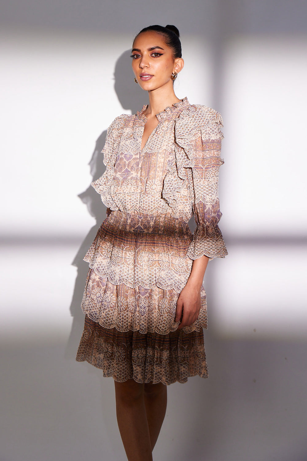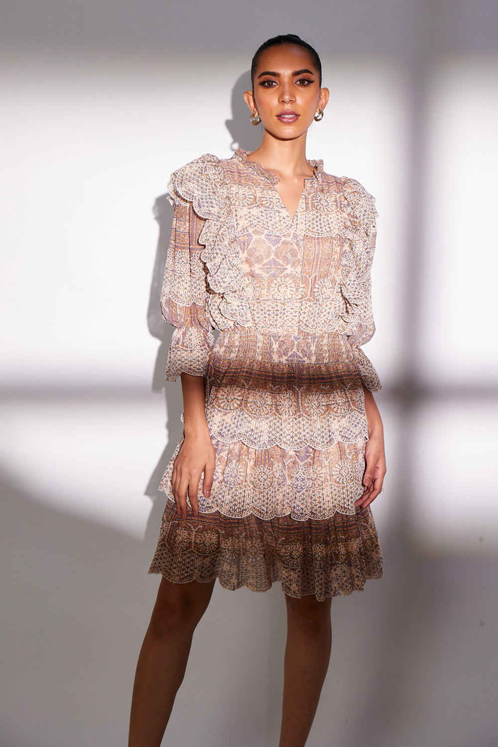 Beautiful broderie layered printed dress. Featuring ruffles and lace trims. We love sporting its dainty print.This style is simultaneously fashion forward and vintage inspired