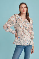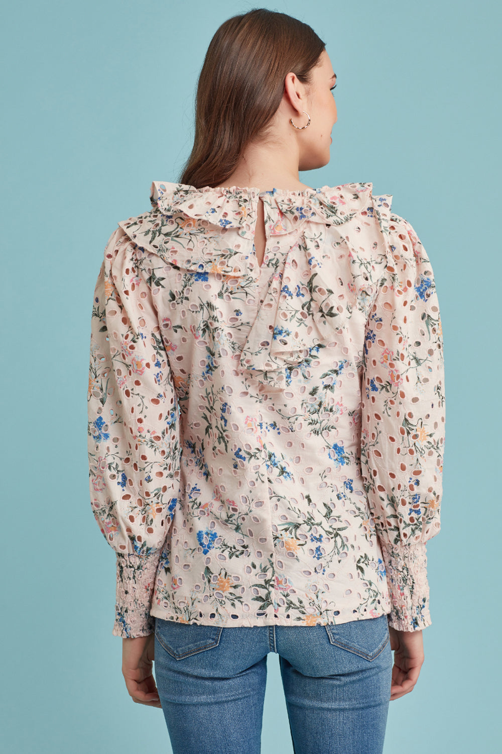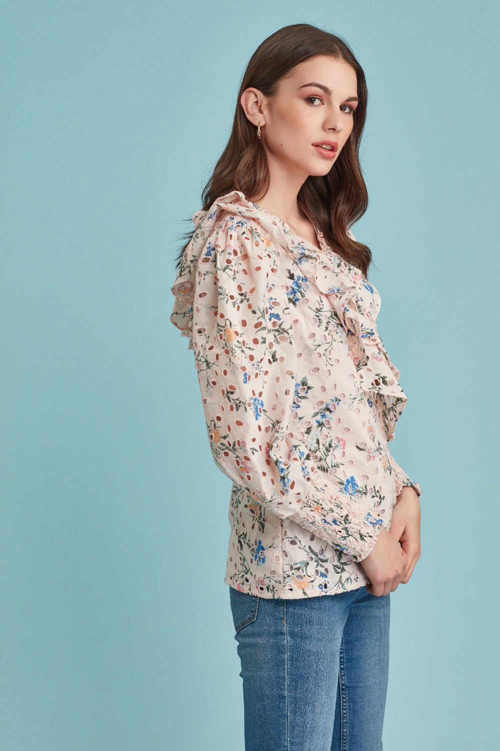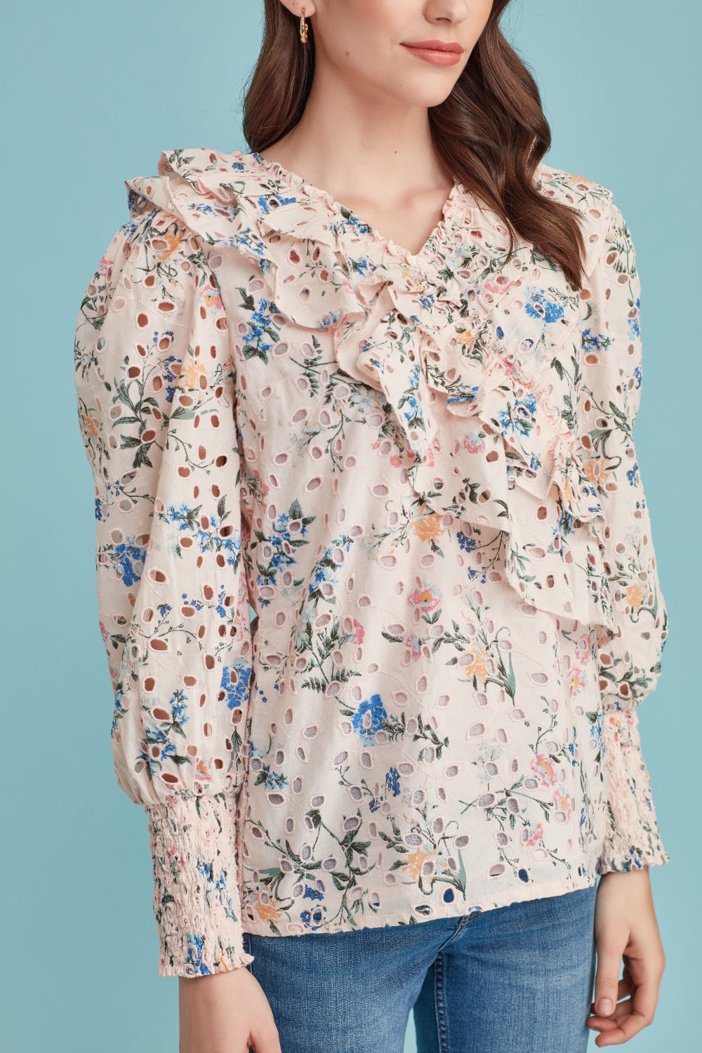 Beautiful broderie printed blouse.Featuring ruffles, shirred sleeves. We love sporting its pastel hues.This style is simultaneously fashion forward and vintage inspired