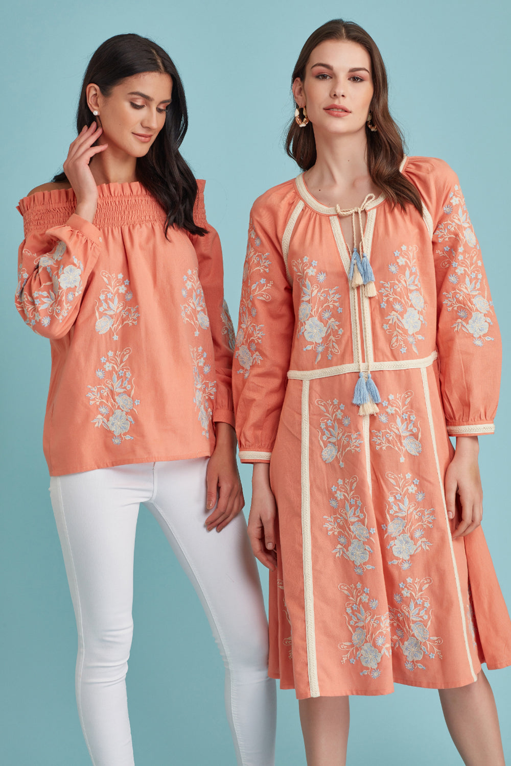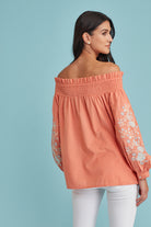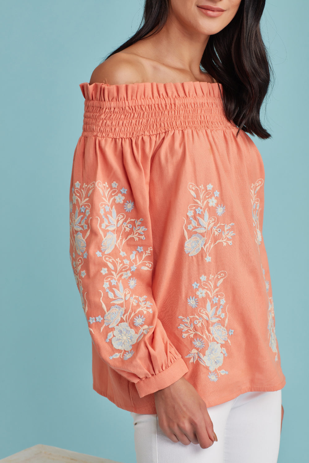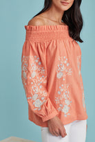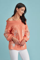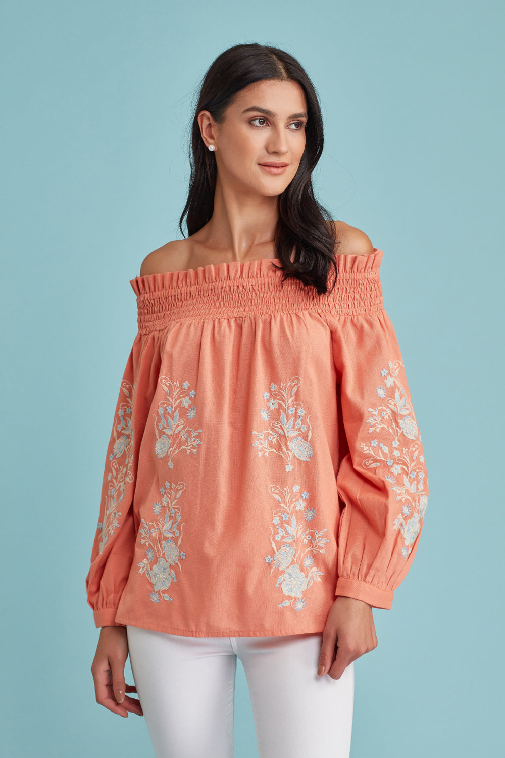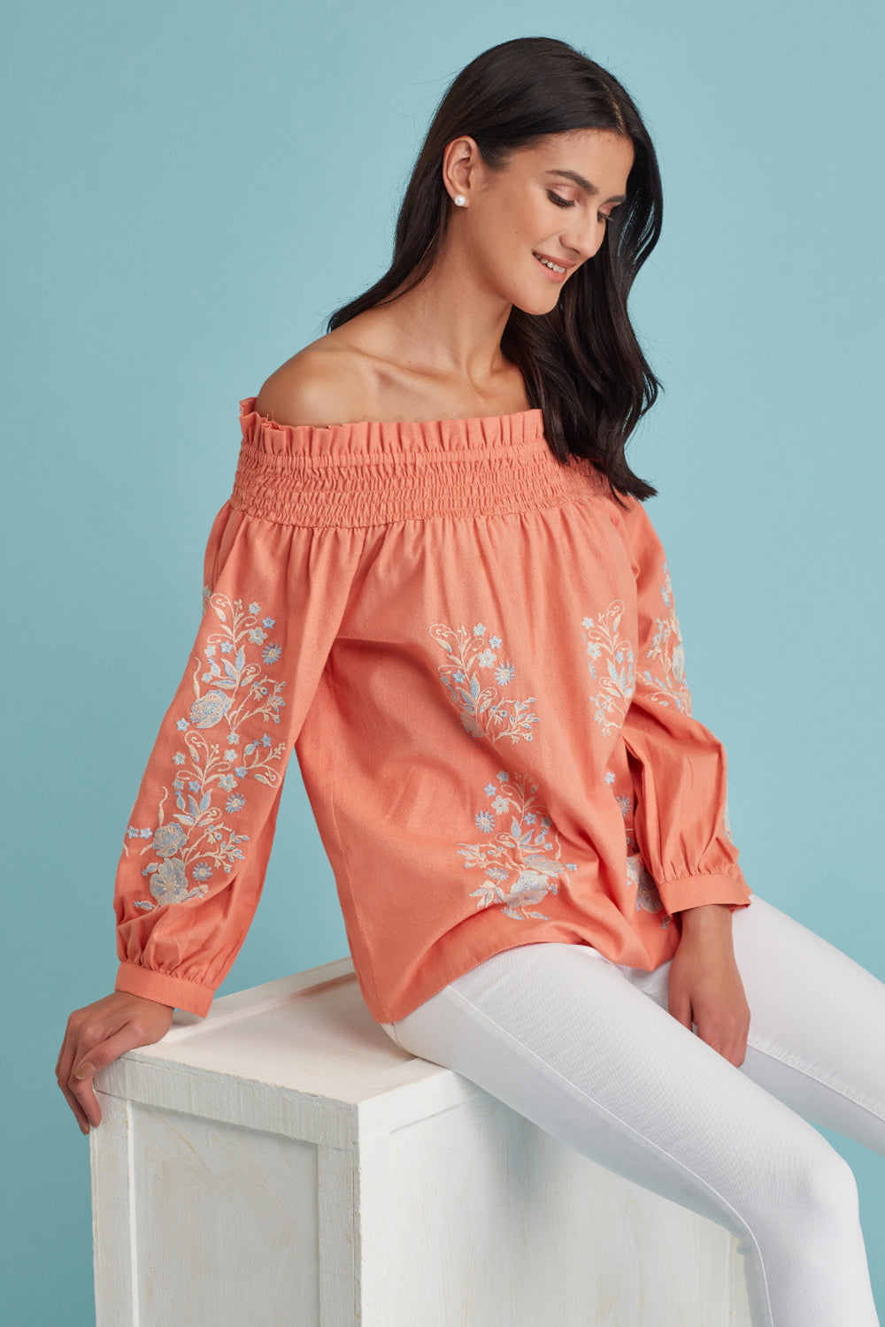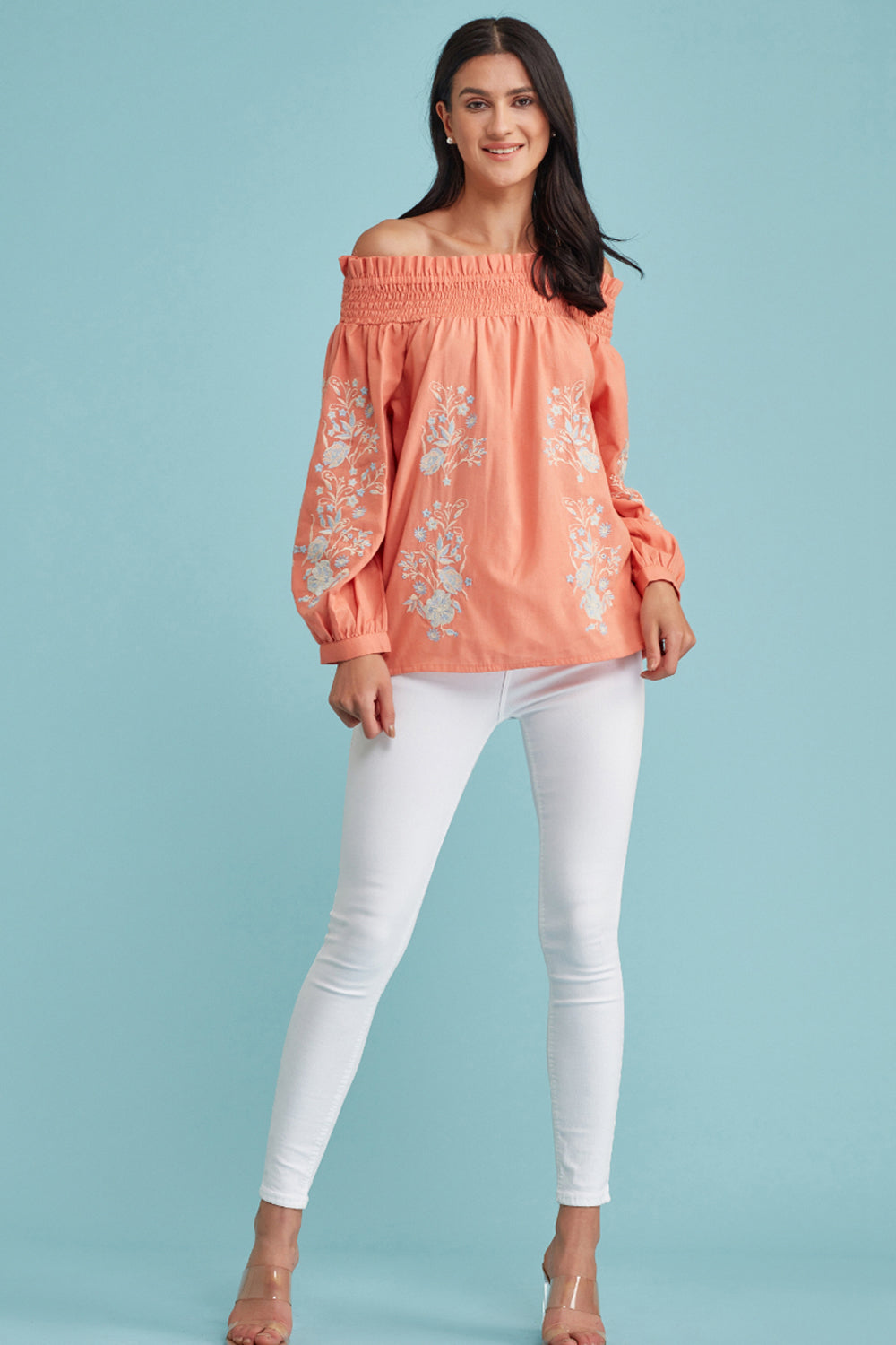 The intricate embroidery on this off the shoulder blouse is inspired by the mughal gardens.