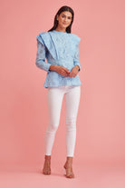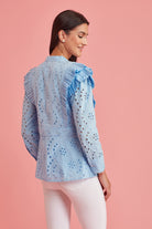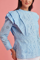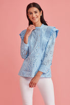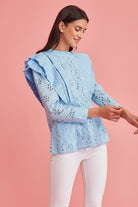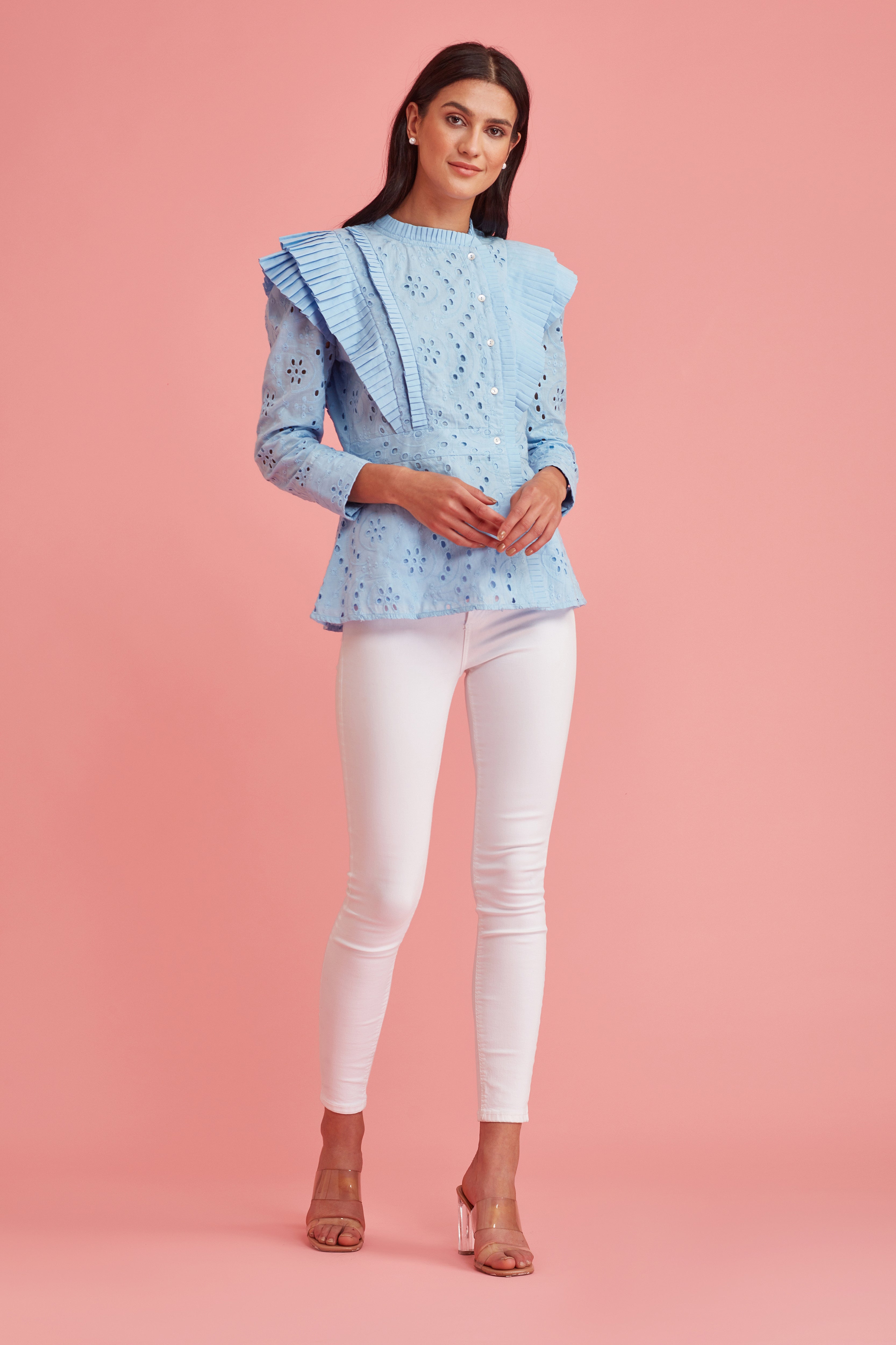 From its structured sleeves to the detailed pleated finish,this stunning eyelet blouse is a study in dainty details.Pair it with distressed denim for a look that is both comfortable and endlessly chic.