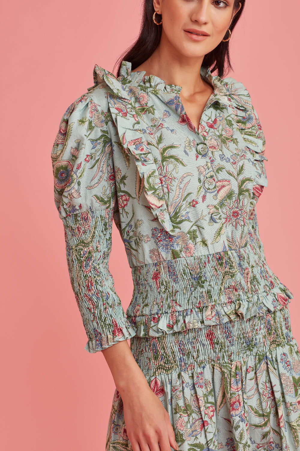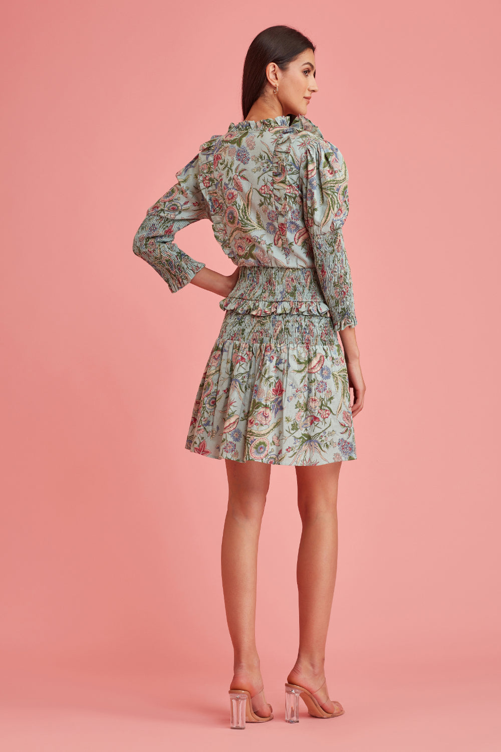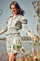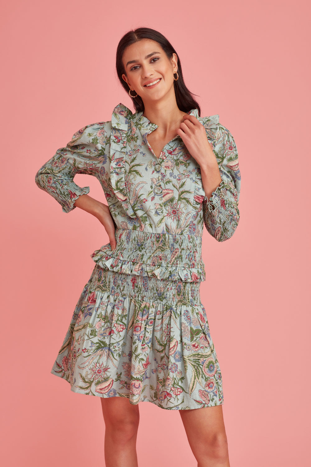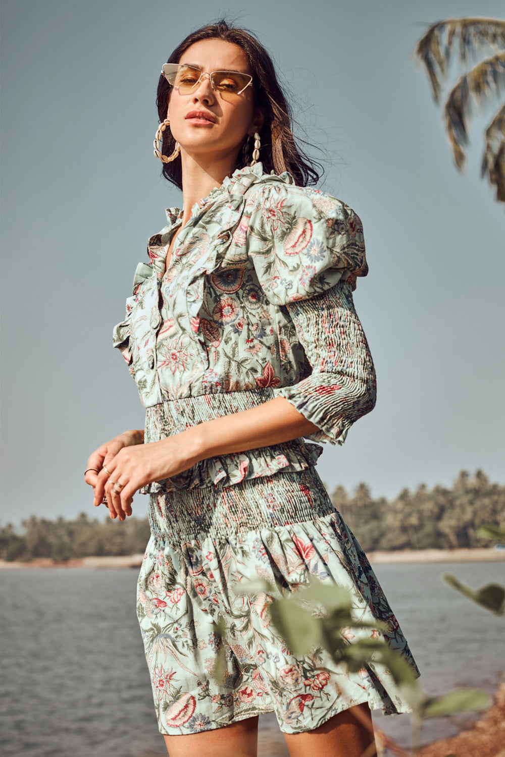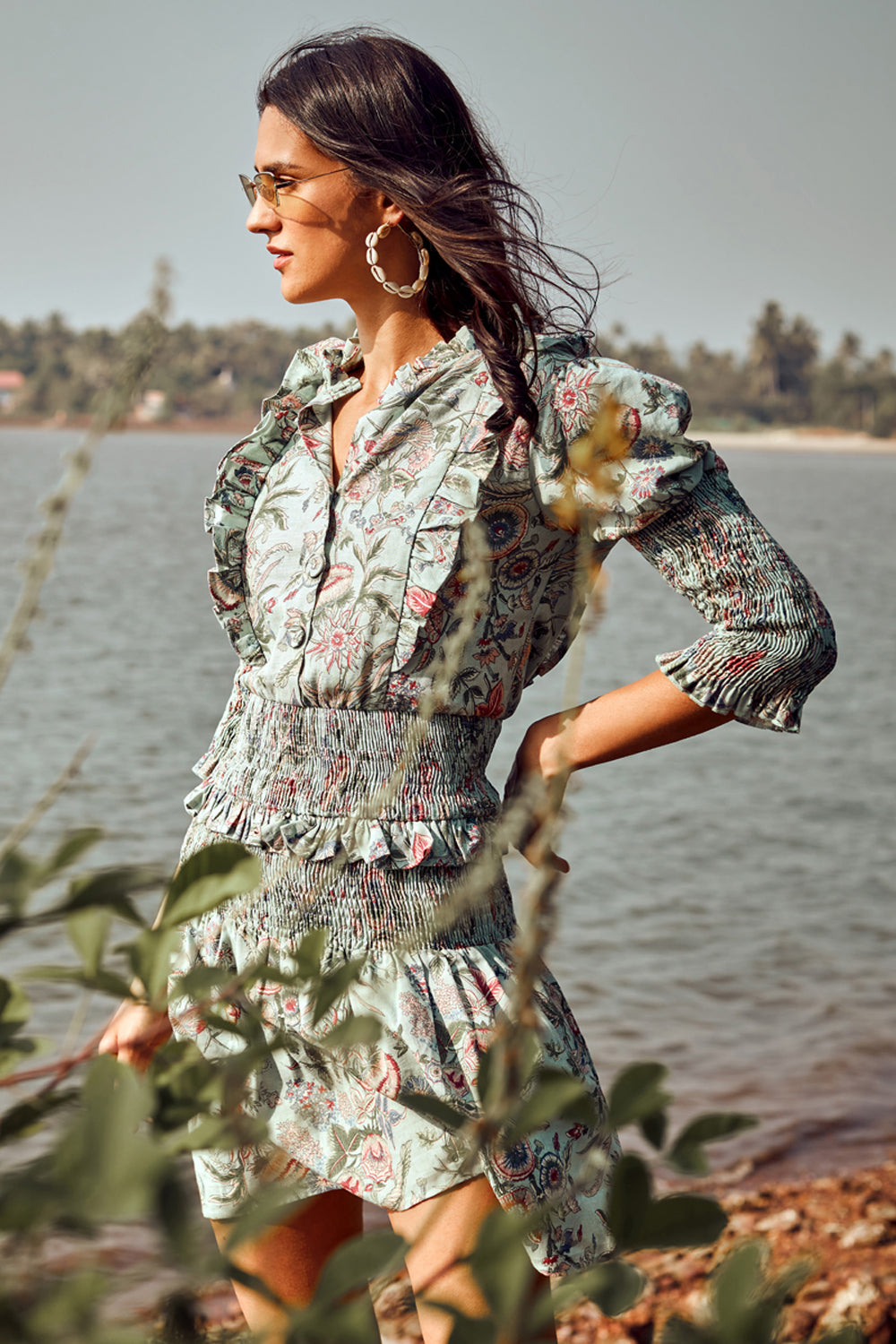 A Boho-Chic exclusive.The shirred sleeves and waistline exclusive floral printed dress is a summer staple. Ruffles on the yoke makes the dress flattering, feminine and versatile.