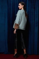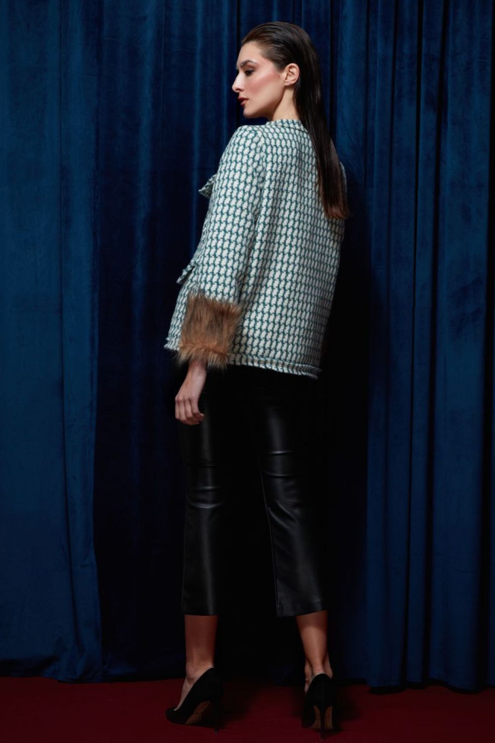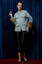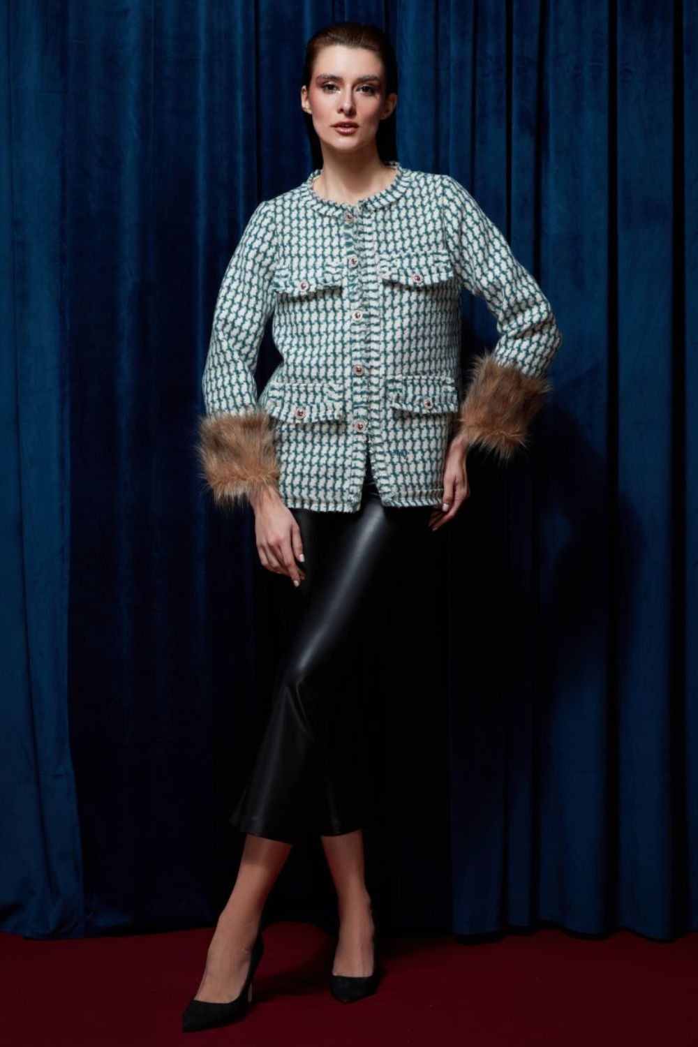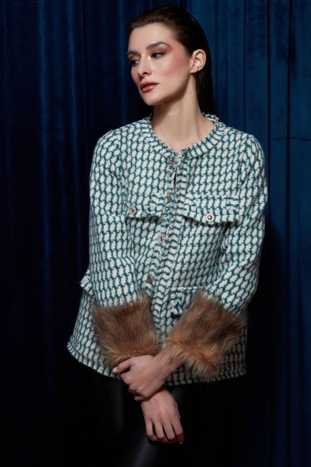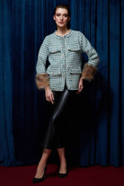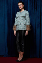 Tweed jacket in beautifully crafted fabric detailed with faux fur, beautifully crafted buttons and raw edges.