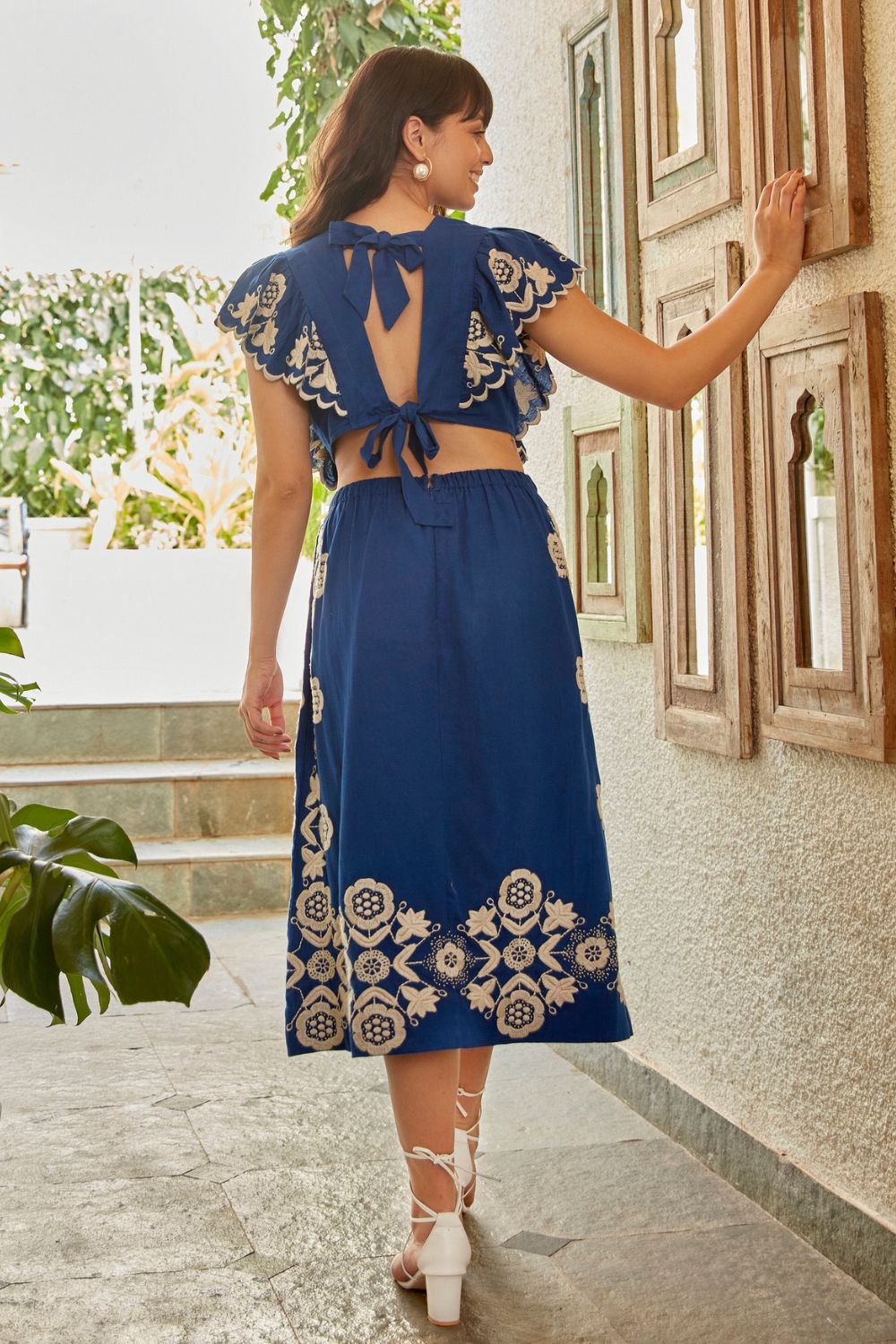 Luxury is something very exclusive, that can pass down your generation. Taking inspiration from architecture and travel, V back with a bow tie and gorgeous embroidery and an absolute stunning midi dress.
