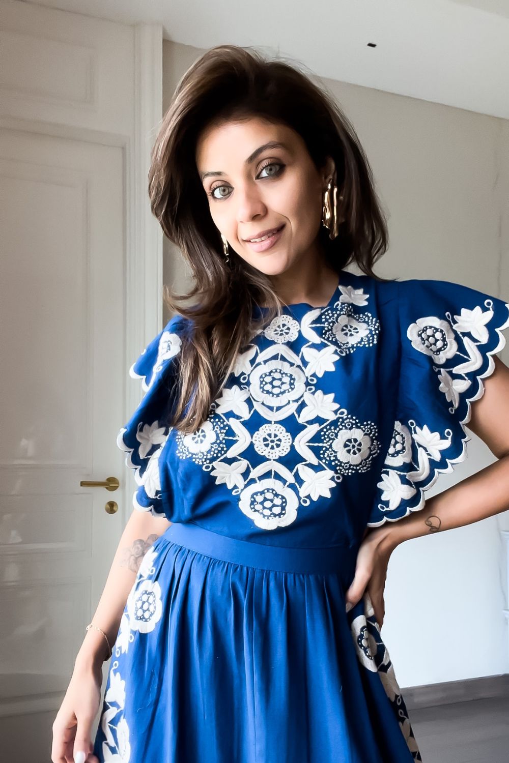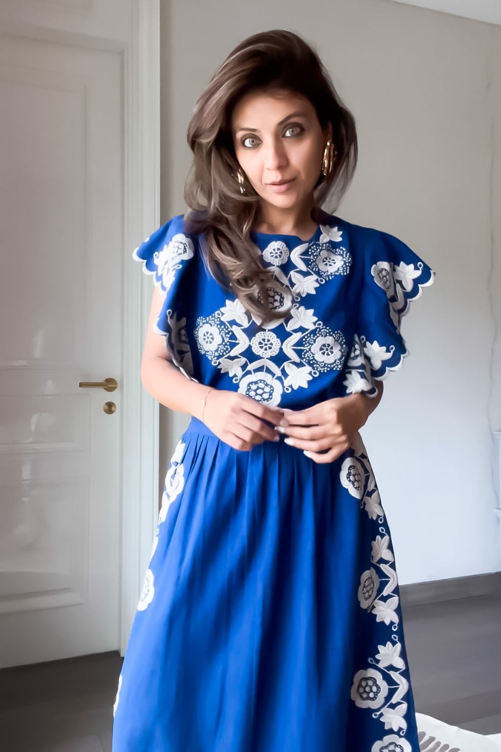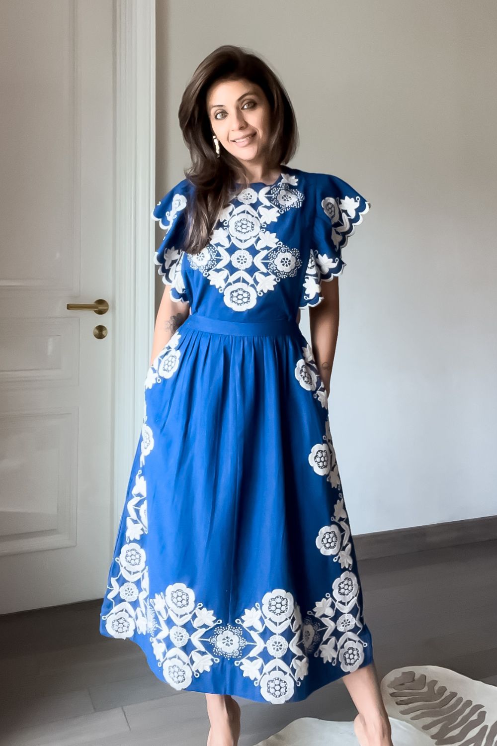 Nriti Shah In Our Flutter Sleeved All Over Embroidered Midi Dress