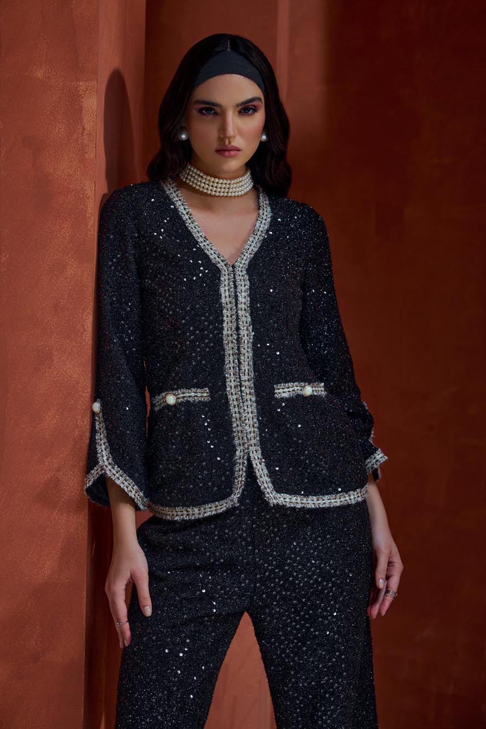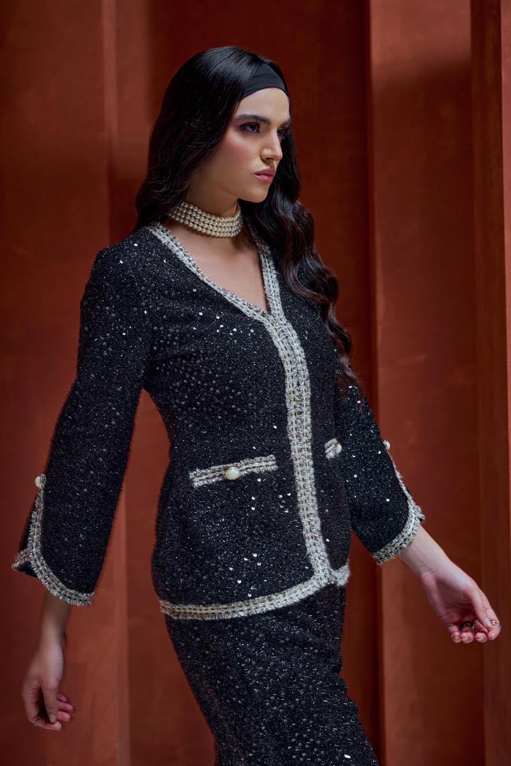 Glimmering sequinned tweed coord set with gold buttons and contrast tweed trims and gold buttons.