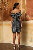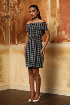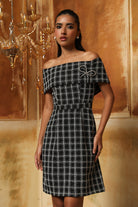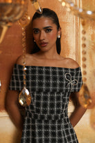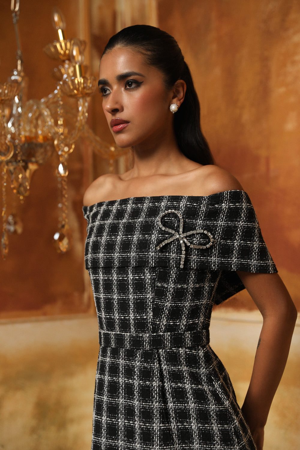 This off the shoulder midi tweed dress with a swaroski studded bow on the neckline is unique and perfect for a party in autumn winter.