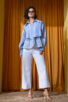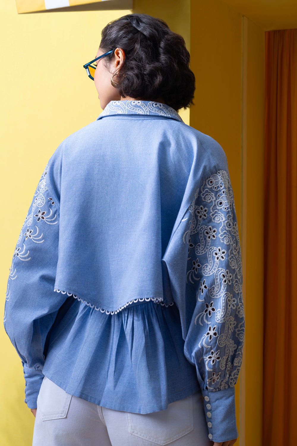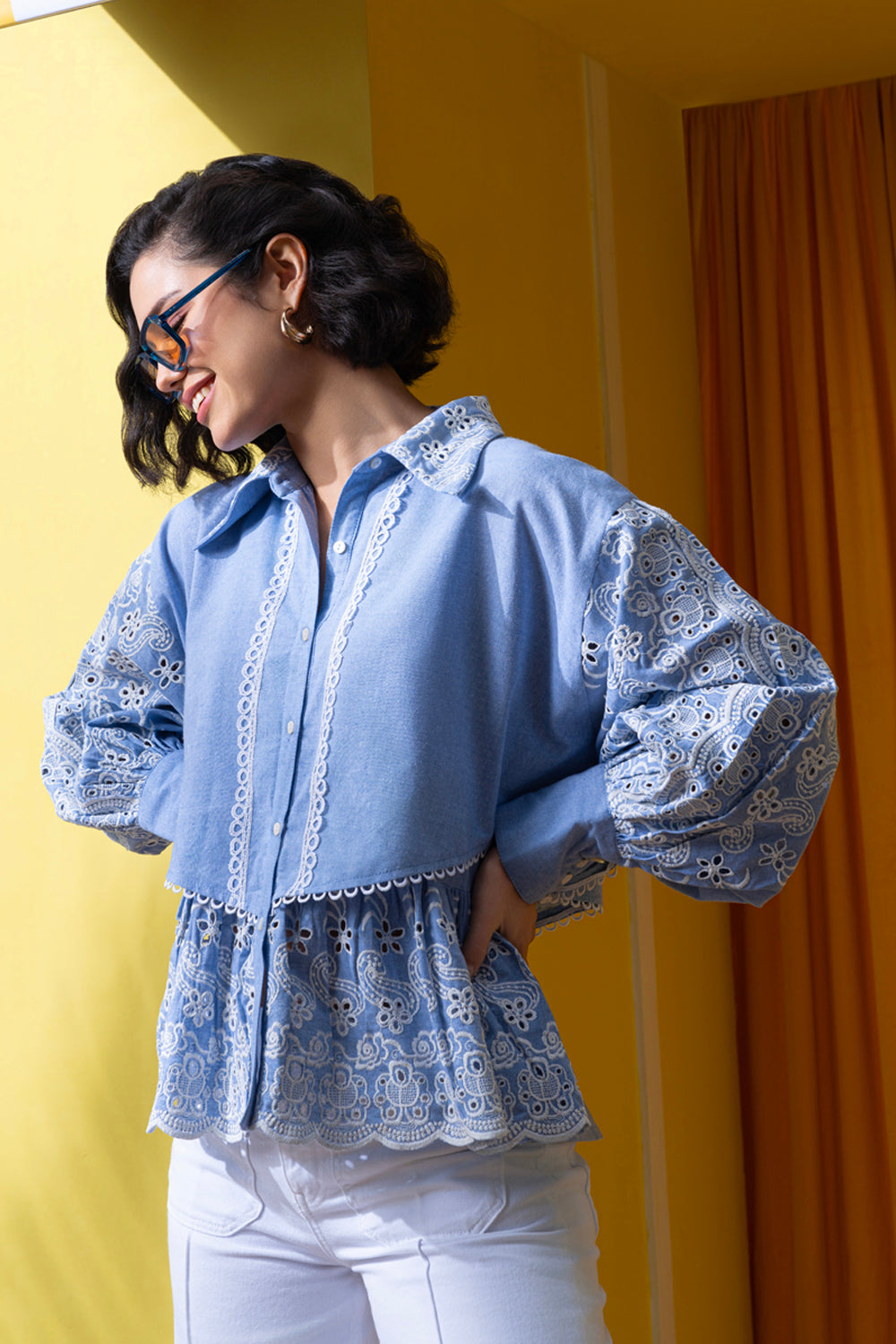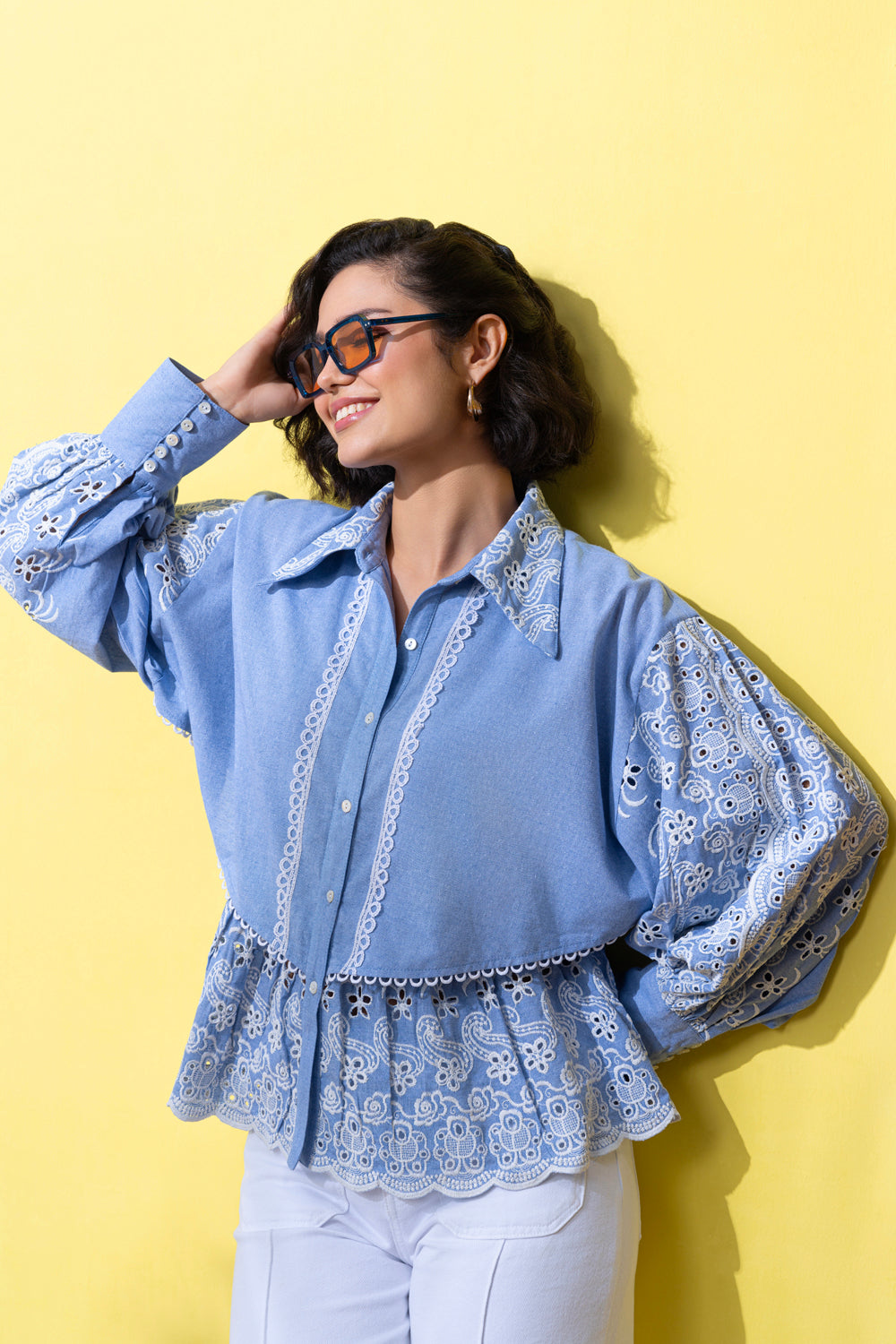 Broderie on chambrey fabric beautifully crafted button down blouse.