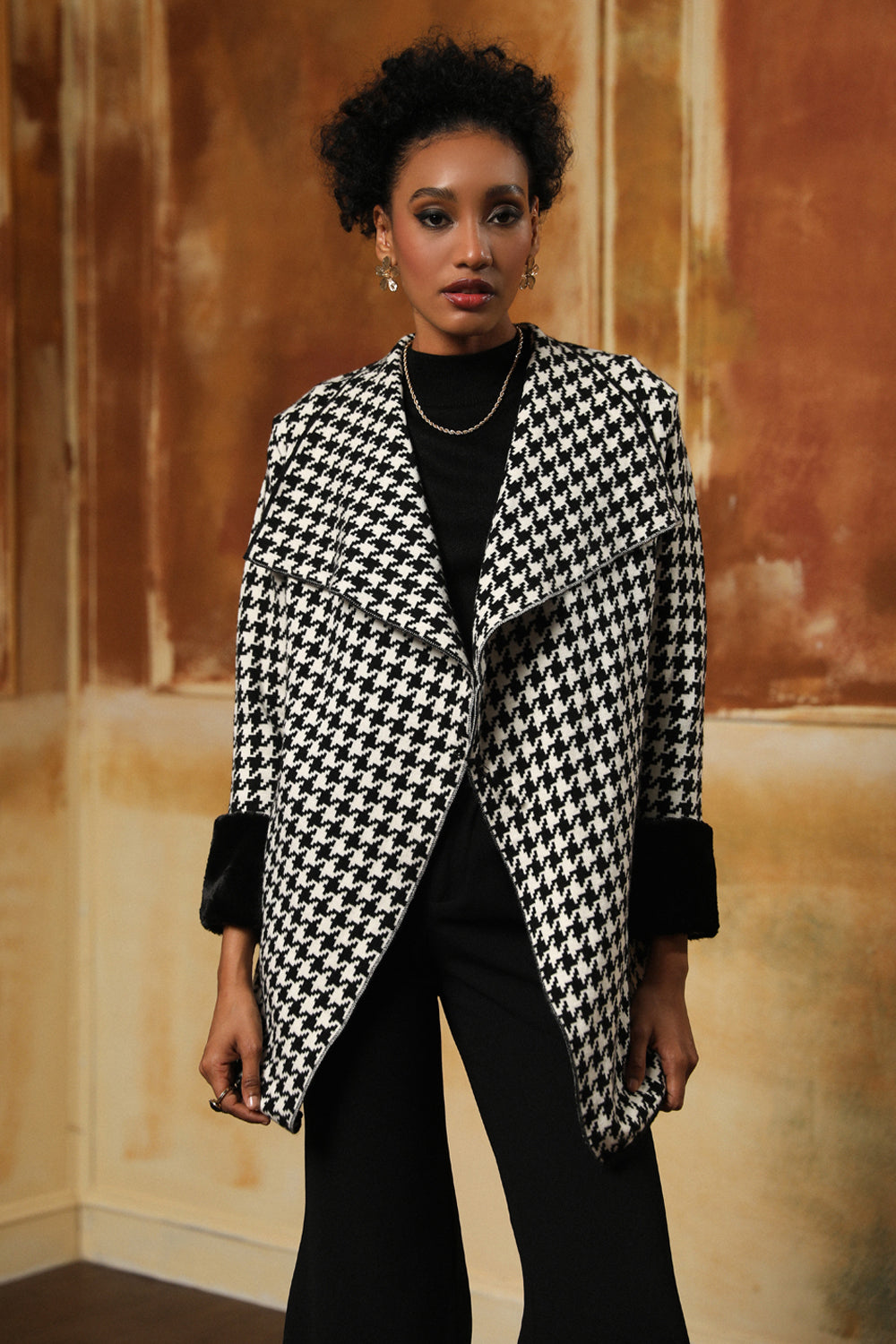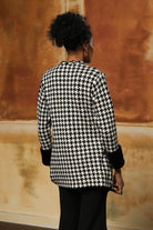Classic ultra soft houndstooth knit with fur on the sleeves.