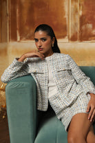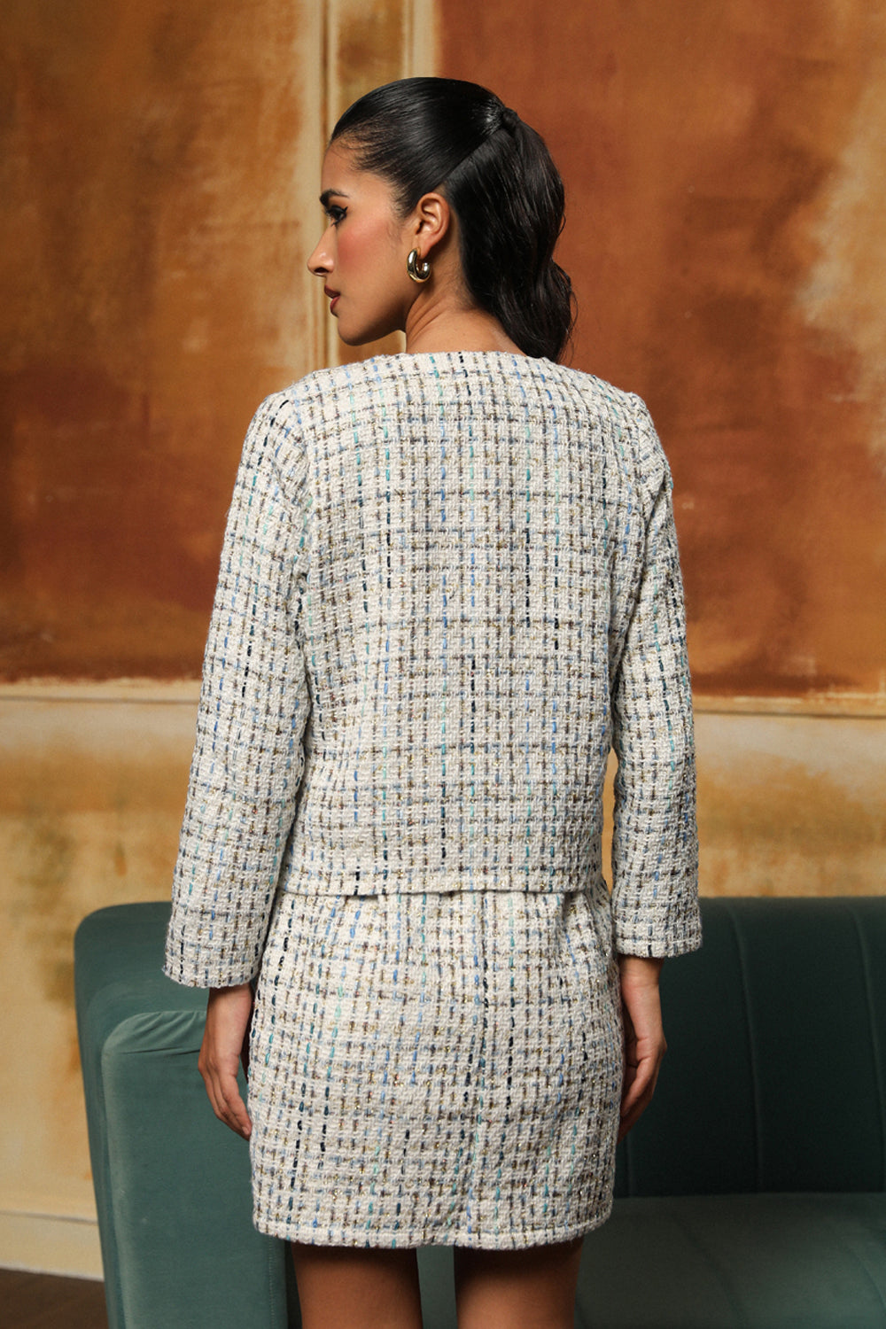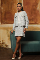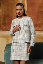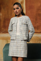 Beautifully crafted tweed dress. The skirt and the jacket are in tweed. The beauty of this dress is that one can wear the jacket as a separate and the dress without the jacket as well.