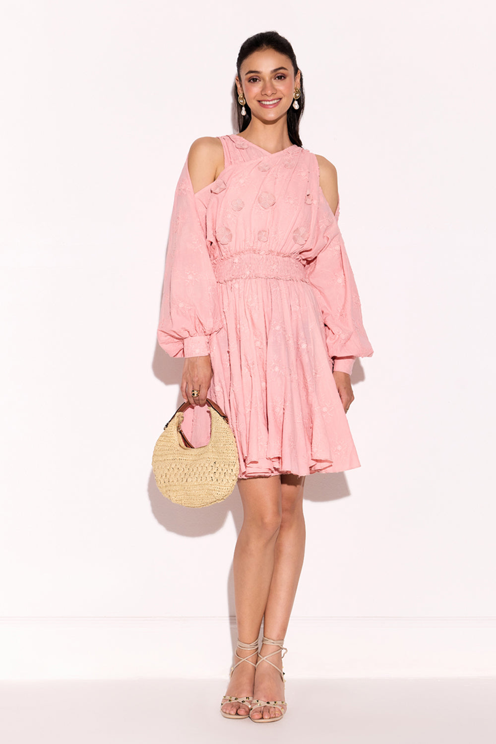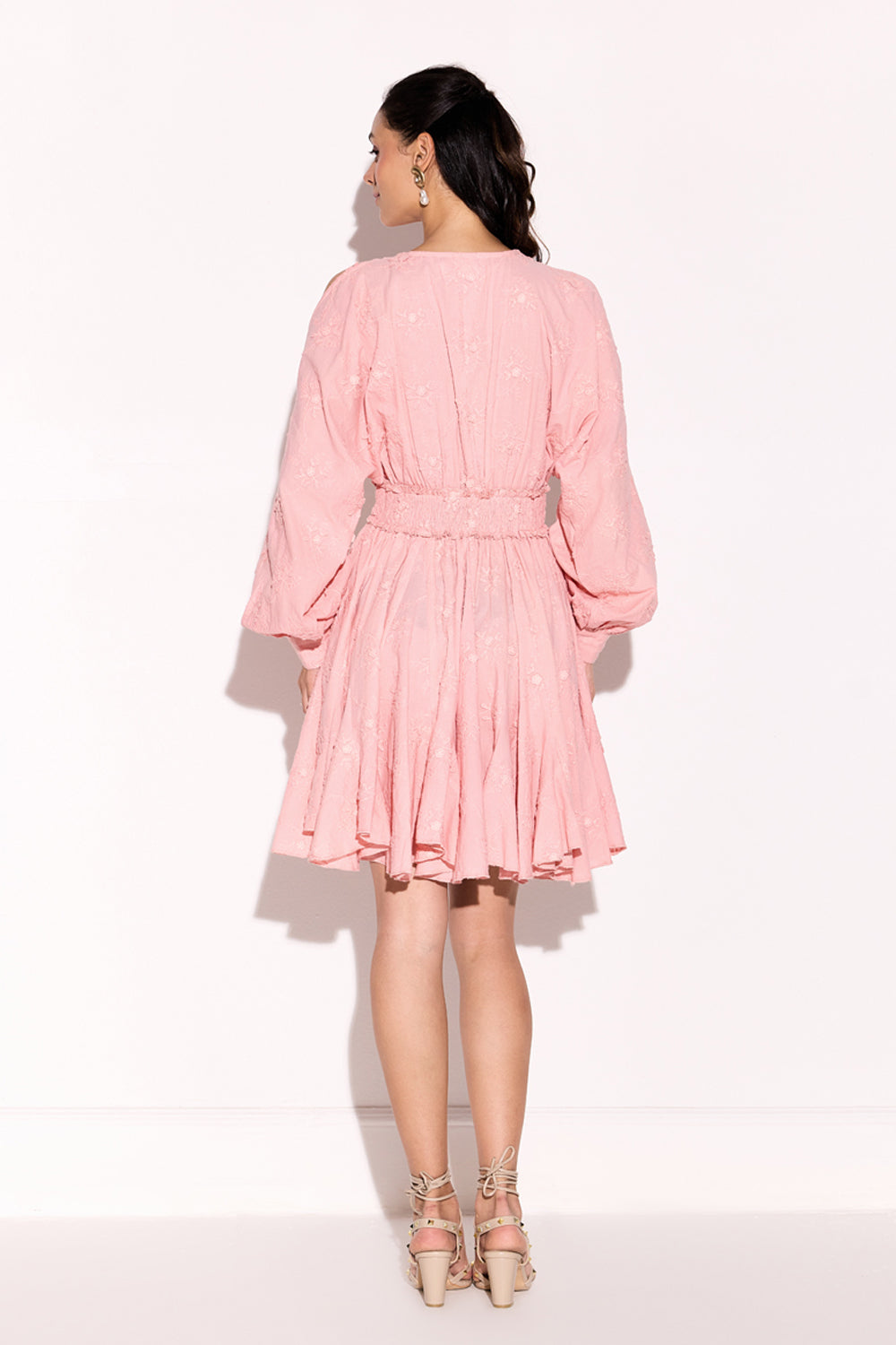 Smoked waistline embroidered applique flowers on the yoke dress.