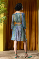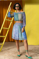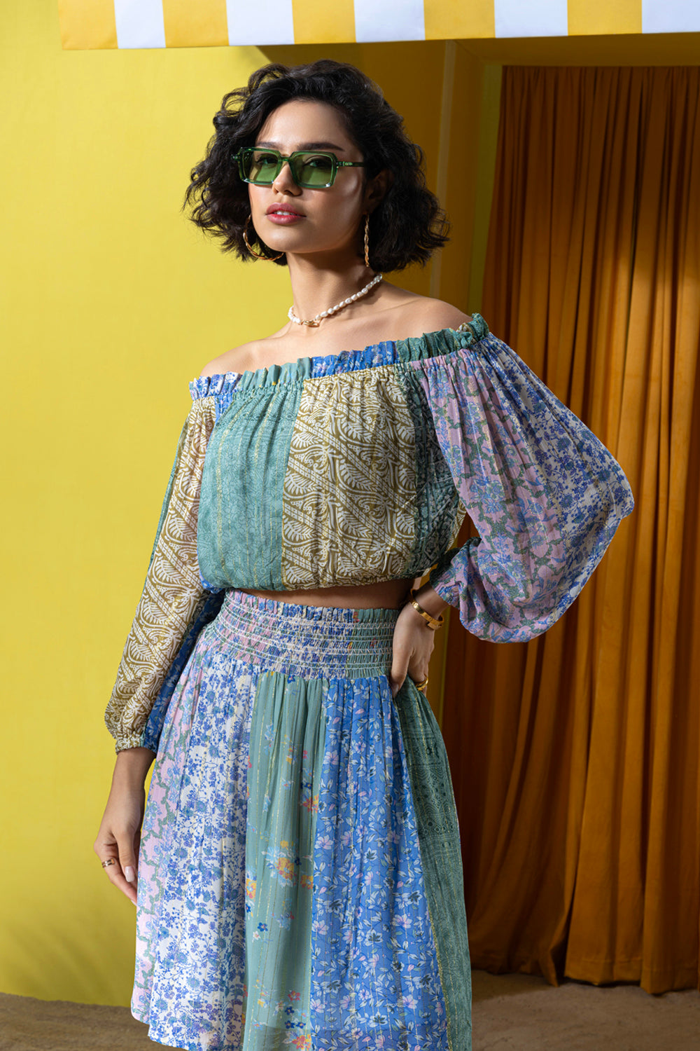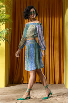 Dainty and delicate all over mixed metallic print and smoked waistline skirt set.