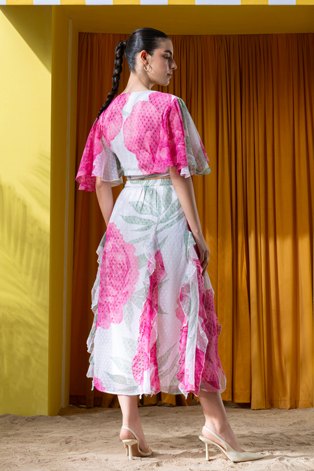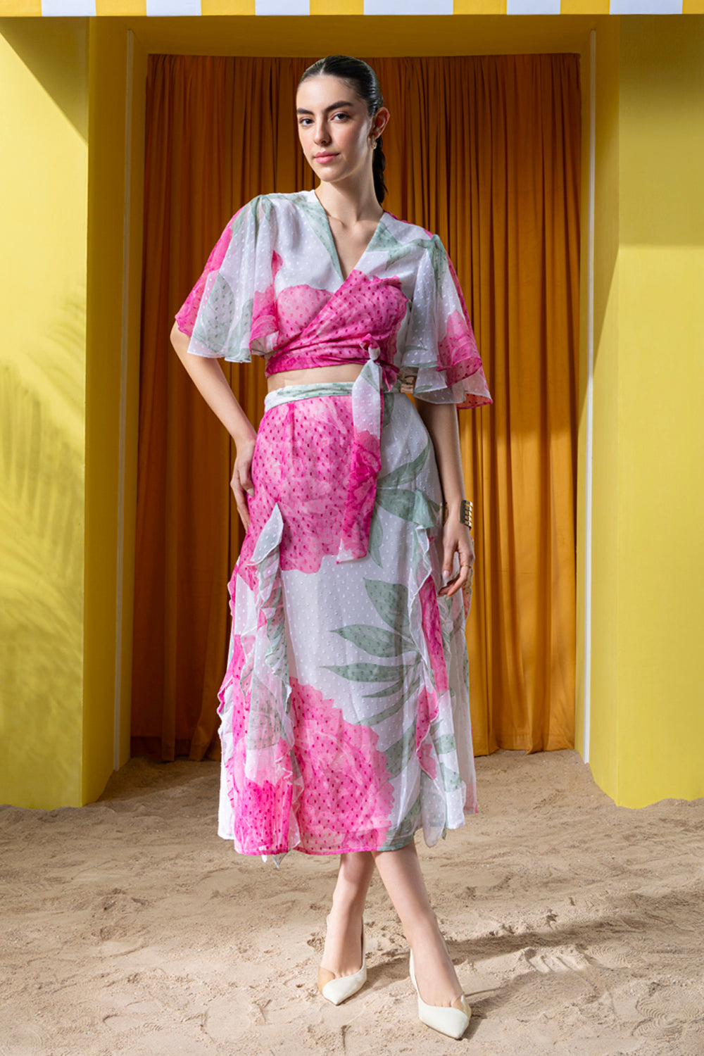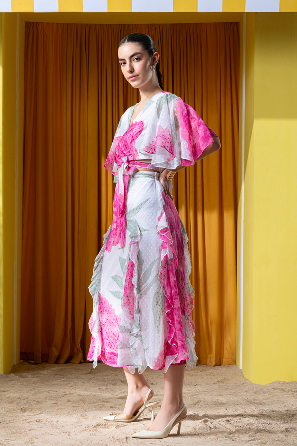 Exquisite Placement print and finely crafted matching set in a feminine silhouette.
