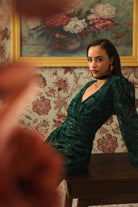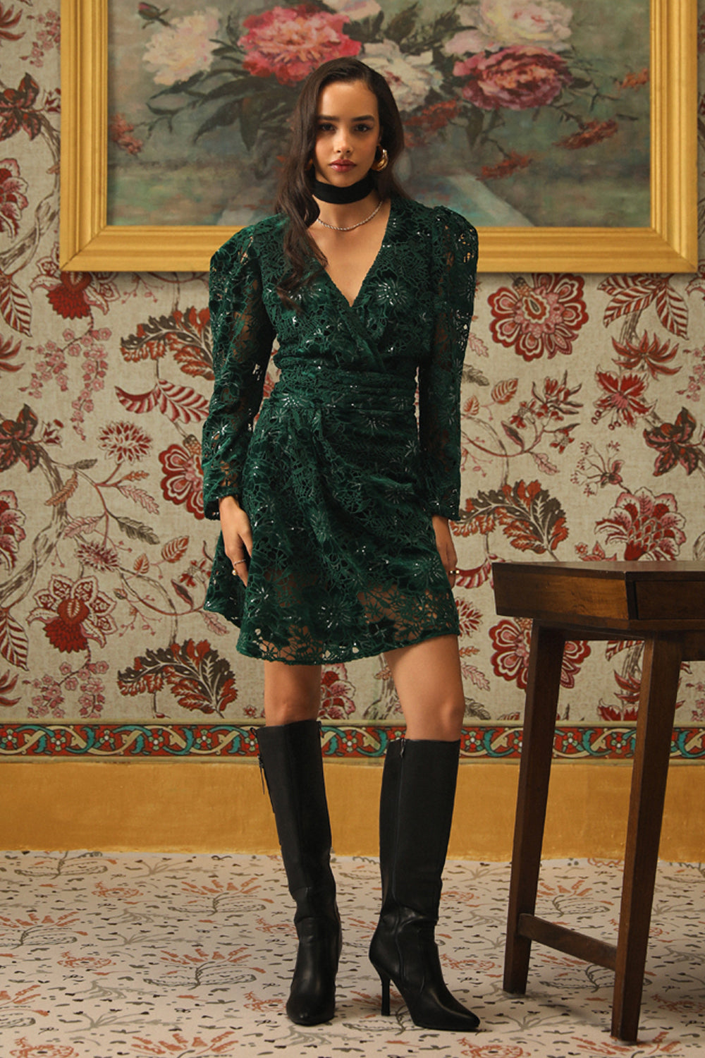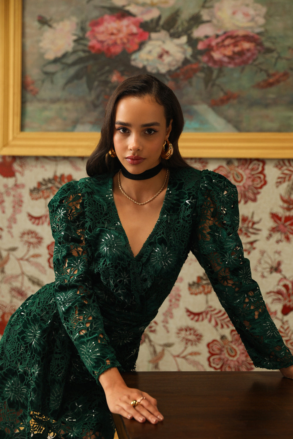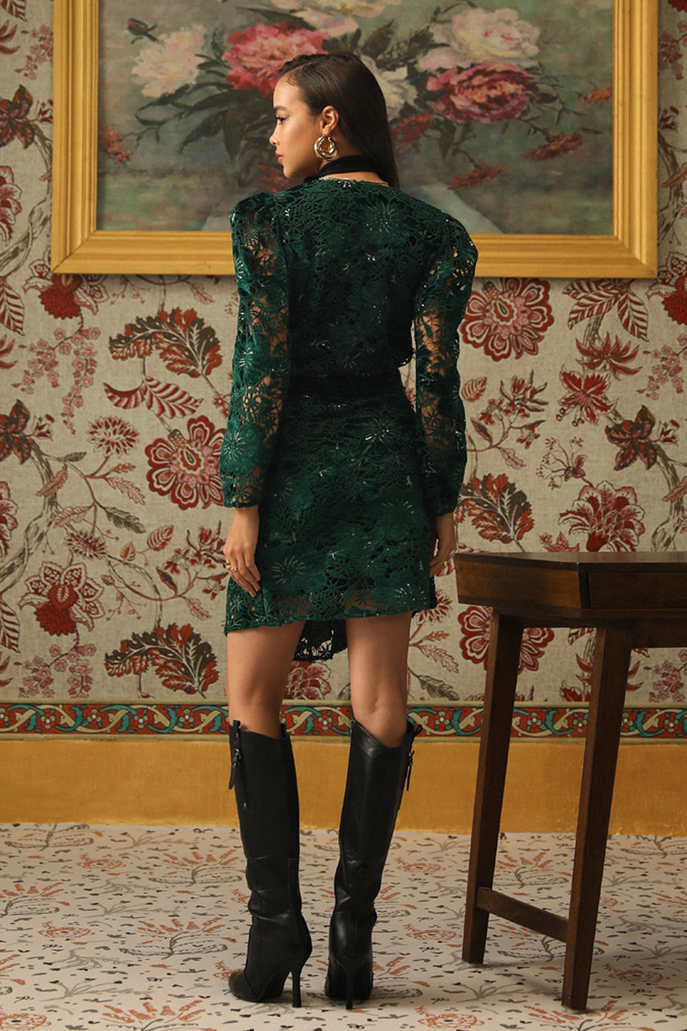 An event ready ensemble. Handwork Sequin detail and velvet applique on premium lace detailed dress with ruched detailed waist band knee length dress. A perfect dress for christmas eve, new years or a milestone celebration party!
