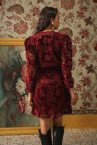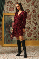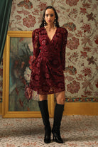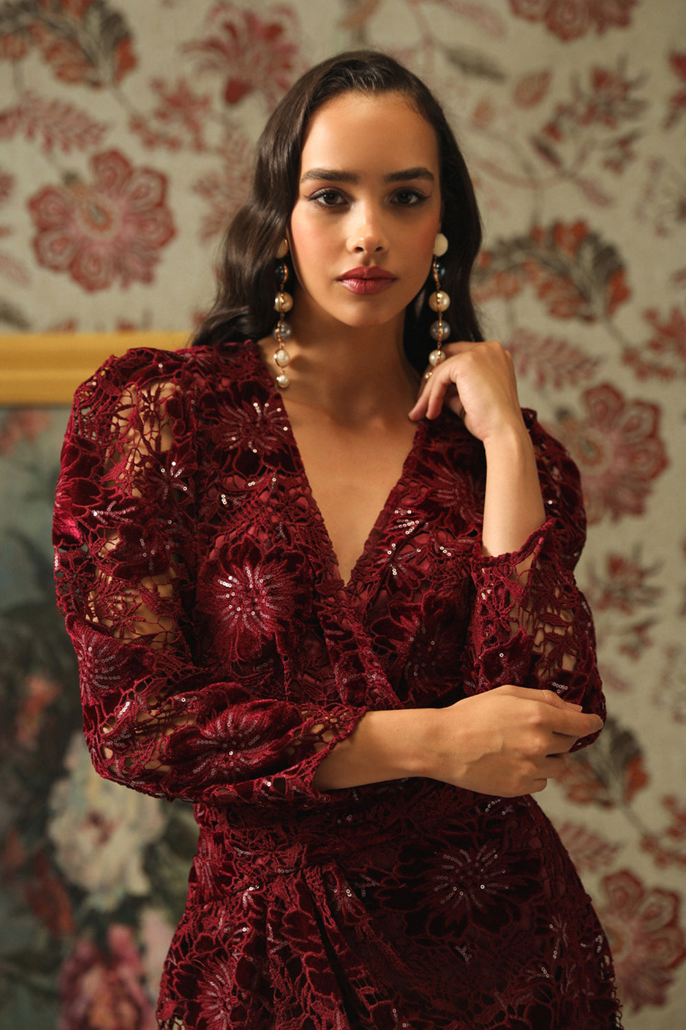 An event ready ensemble.Handwork Sequin detail and velvet applique on premium lace detailed dress with ruched detailed waist band knee length dress. A perfect dress for christmas eve, new years or a milestone celebration party!