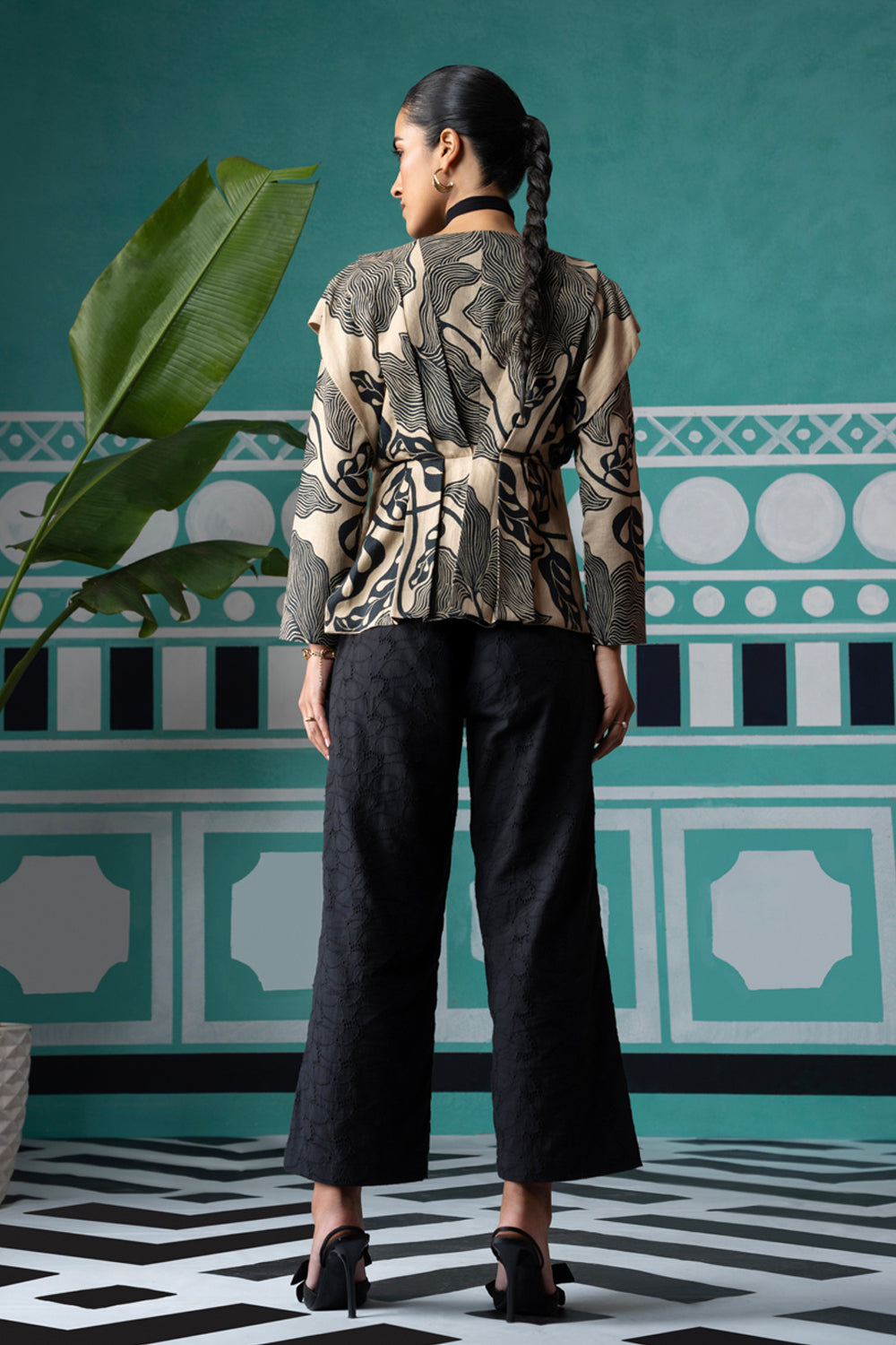 Pleats please blouse in a striking print and broderie pants.