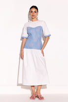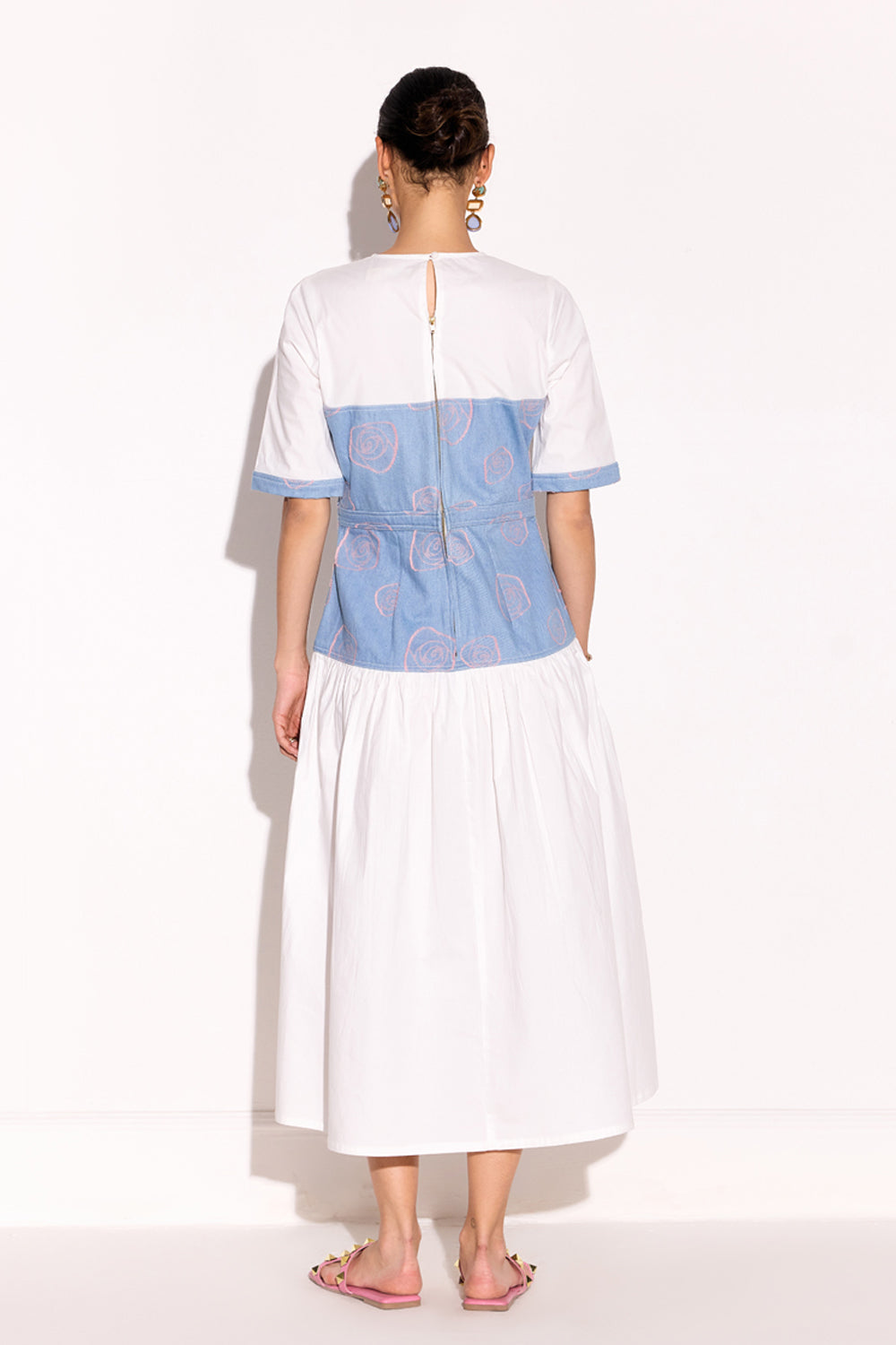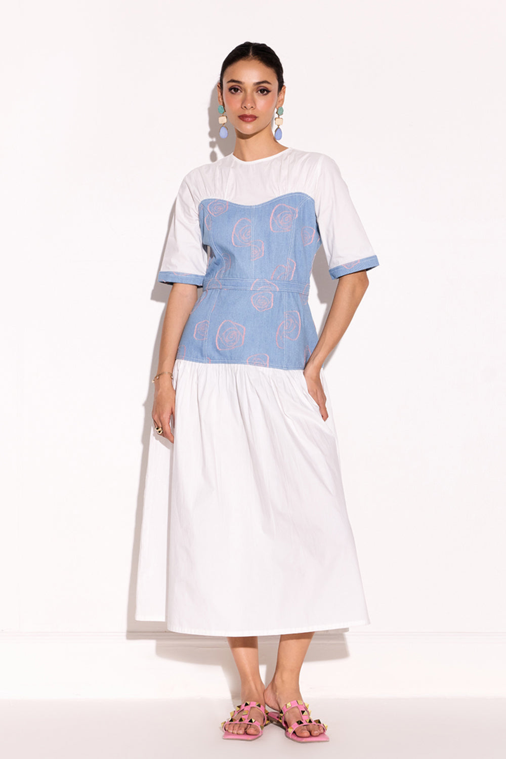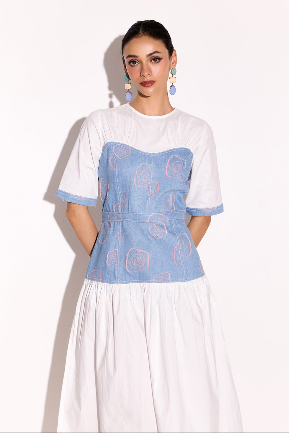 Exquisite silhouette with a denim bodice and all over applique roses .Perfect for a brunch or a sun downer.