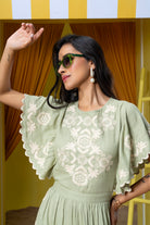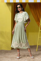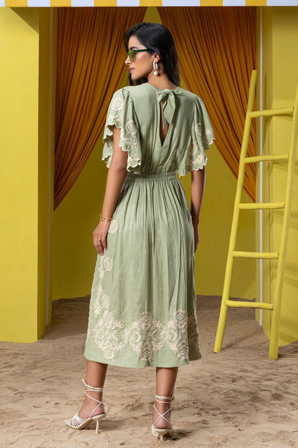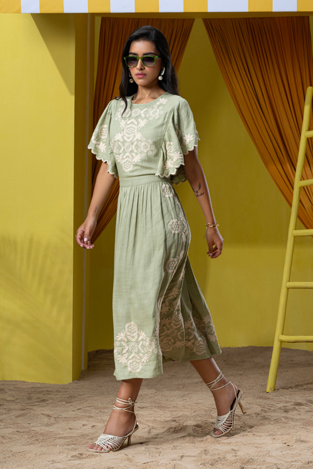 Matcha Flutter Sleeved All Over Embroidered Midi Dress