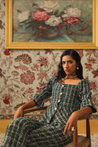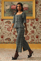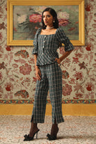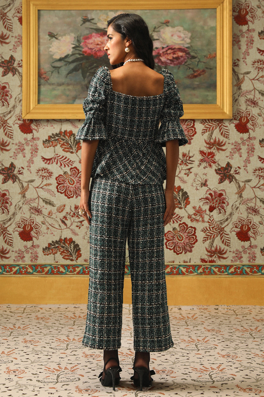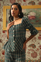 Classic and exquisite metallic button down tweed peplum blouse. Very chic and well crafted. Pair it with boots for the perfect winter brunch.