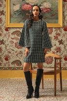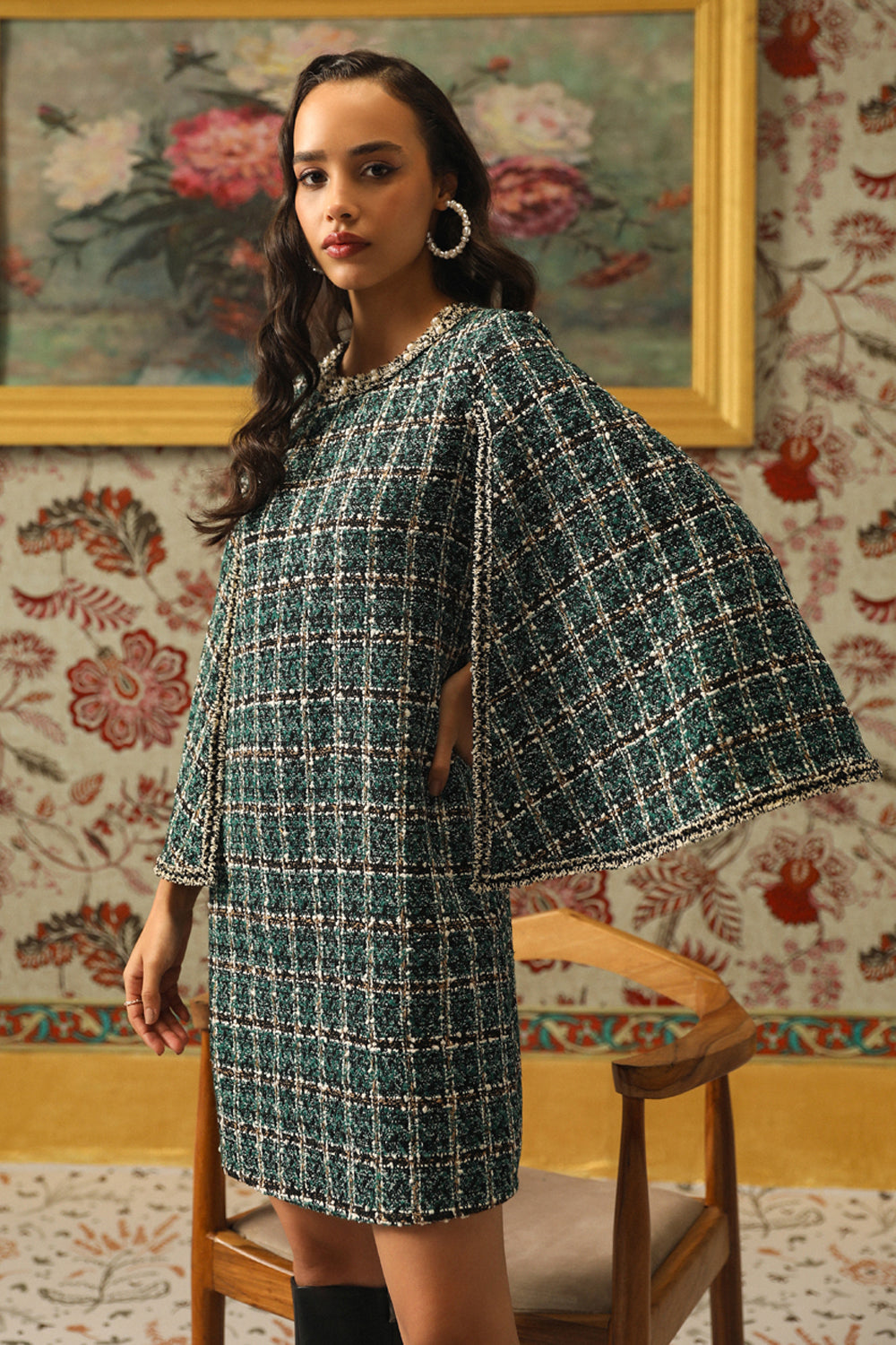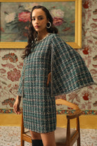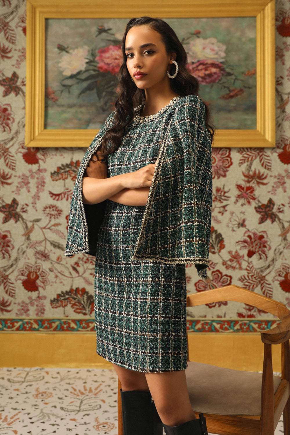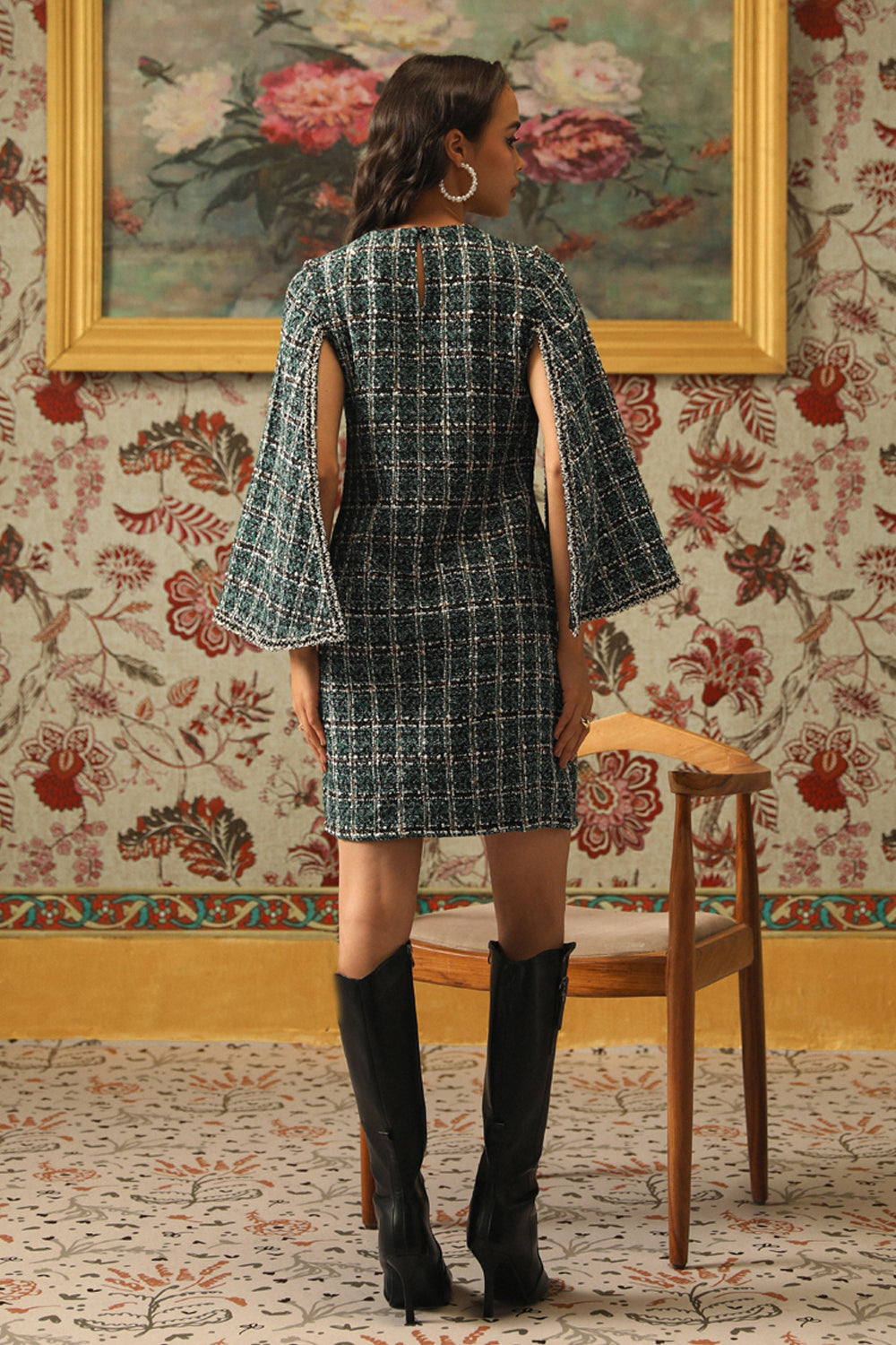 Trending this autumn in our signature cape dress with contrast pearl detailing in the neckline and contrast tweed trims on the cape sleeves. This dress makes it trendy and chic for a winter party.