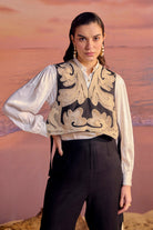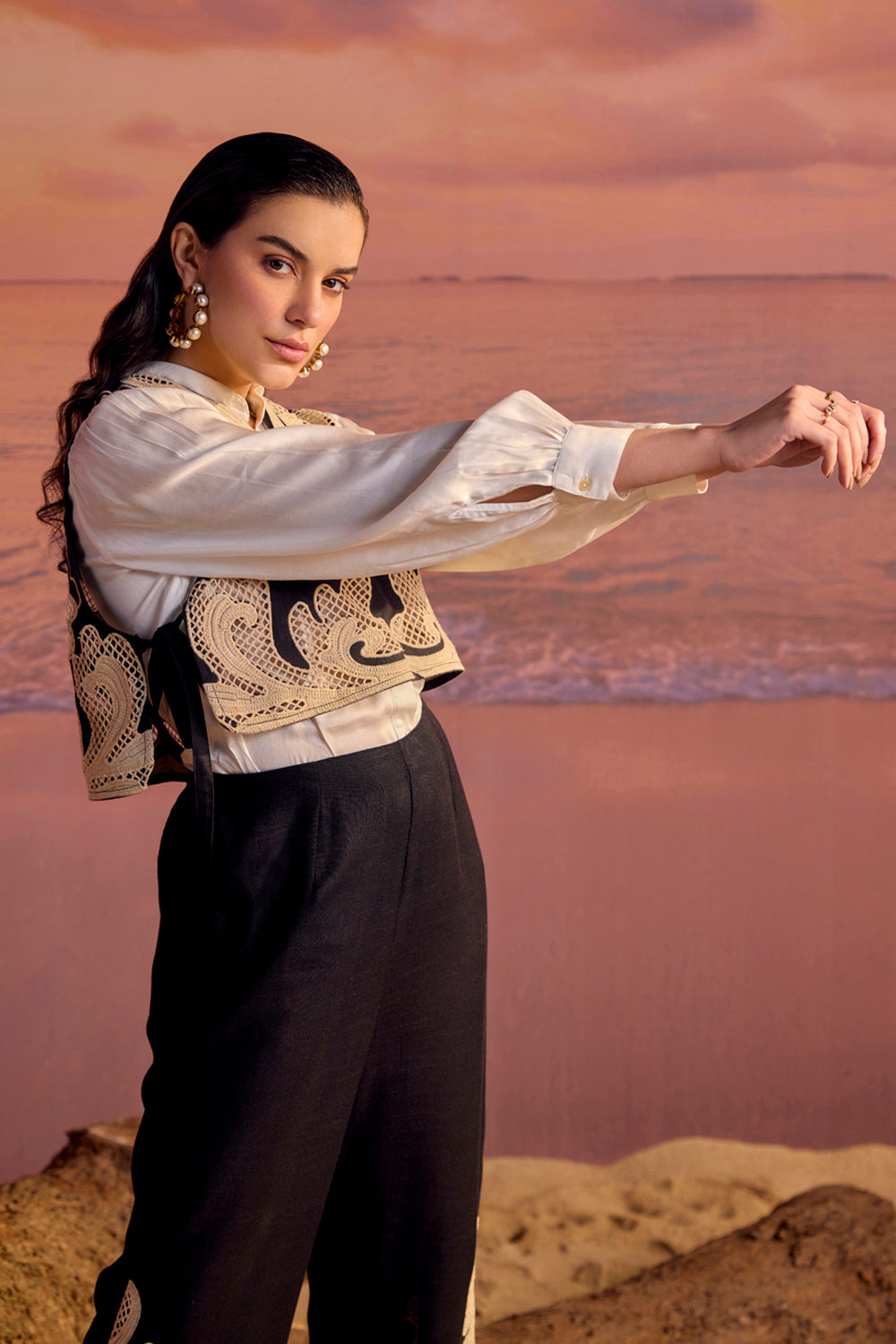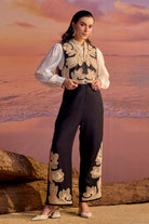 Unique and exquisite cutwork embroidered co-ord set. Fashion forward and exquisitely crafted cutwork embroidered overhaul with button down shirt and cutwork embroidered pants- 3 piece set.