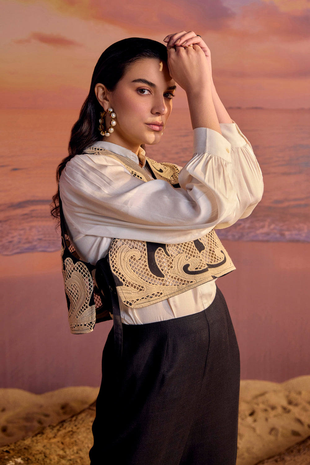 Unique and exquisite cutwork embroidered co-ord set. Fashion forward and exquisitely crafted cutwork embroidered overhaul with button down shirt and cutwork embroidered pants- 3 piece set.