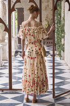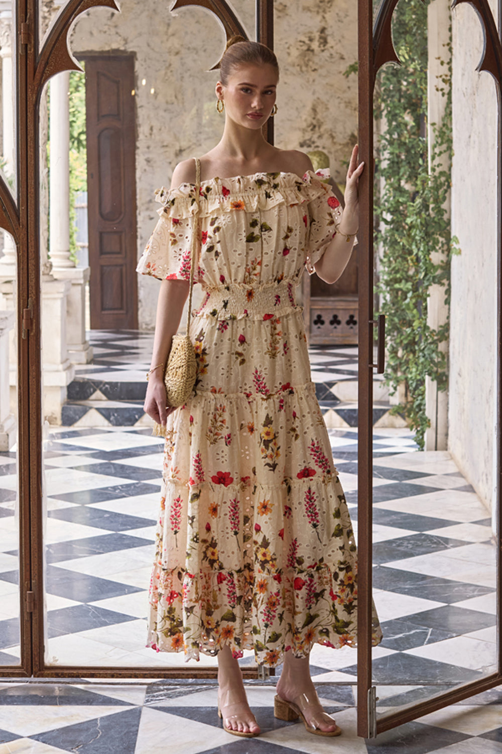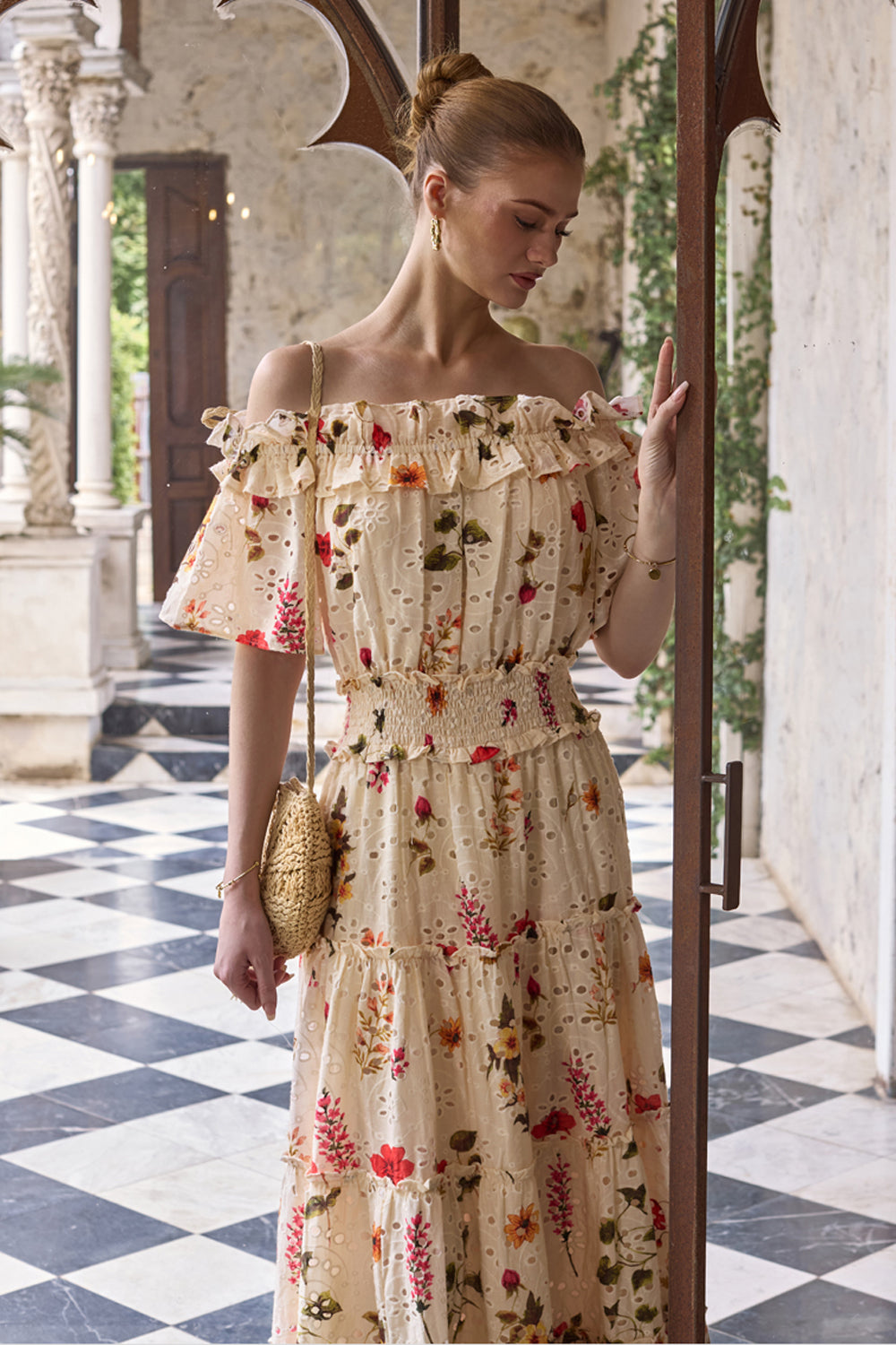 Delicate print on broderie off the shoulder layered maxi dress with a smoked waistline. Perfect for a summer brunch.